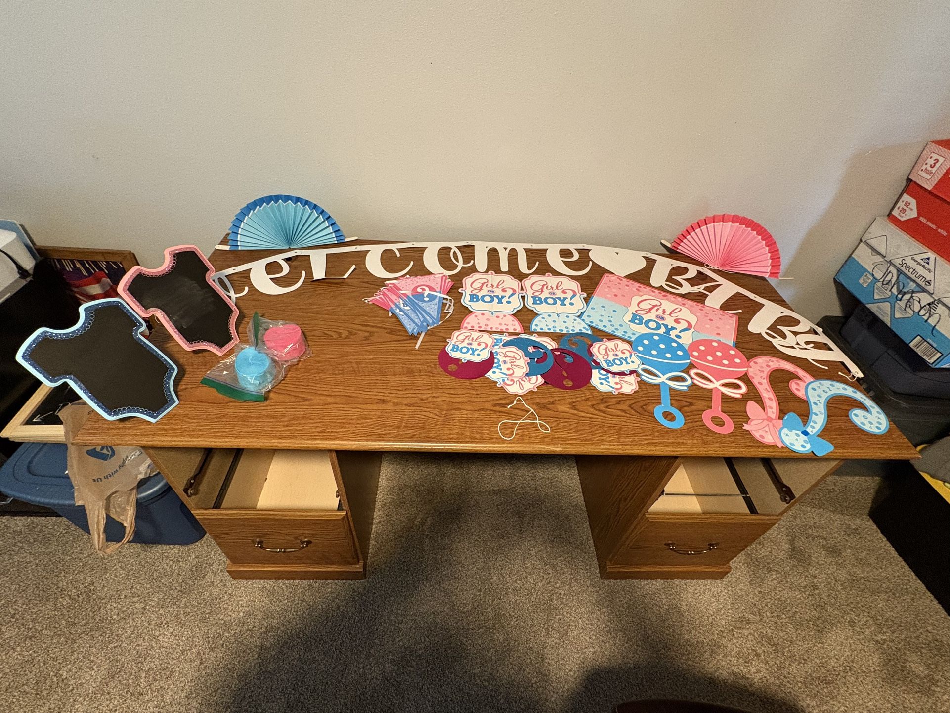 Gender reveal decorations only used once. Welcome baby banner. Two little chalkboards. Blue and pink plastic tablecloths with quite a bit on it. The rest of the decorations you can see in the one picture of what all it comes with. $20 for all or OBO.