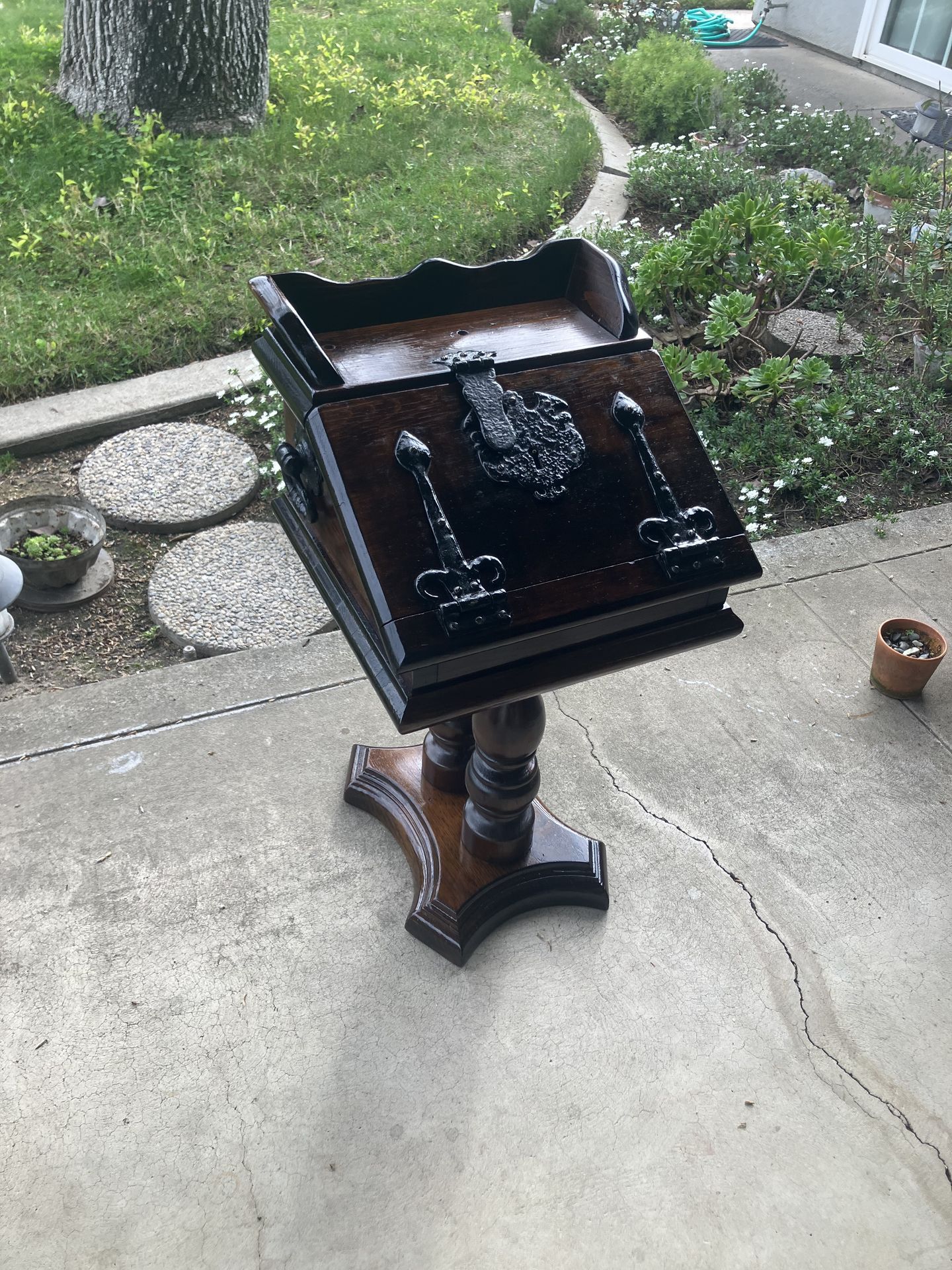 This table is cool-kind of a unique nautical theme. The table is 32 inches tall and has a locking space on top using an old style lick and key.