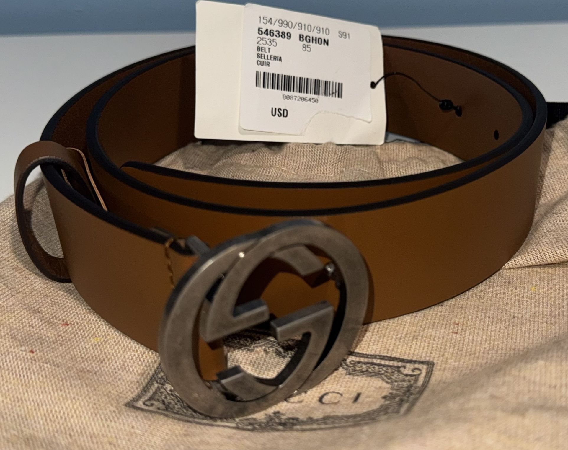 GUCCI GG BELT BROWN LEATHER AUTHENTIC BRAND NEW PROOF OF PURCHASE with DUST bag SIZE 85/36 $$$280$$$