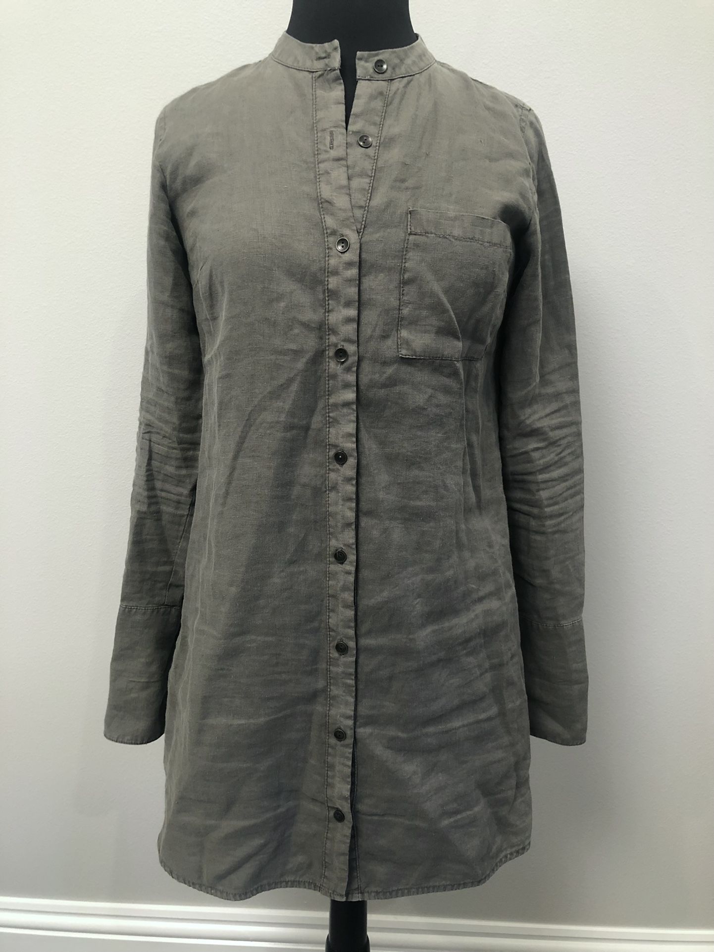 Brand New Michael Stars shirttail button down woven linen dress with band collar and extra long sleeve cuff with one button. Front chest pocket, brass buttons, and pleat in back. Color is camo (grayish green). Size XS, 31” from shoulder to hem in front, and 34.5” from shoulder to hem in back. Note it may need ironing as it was kept in original shopping bag.