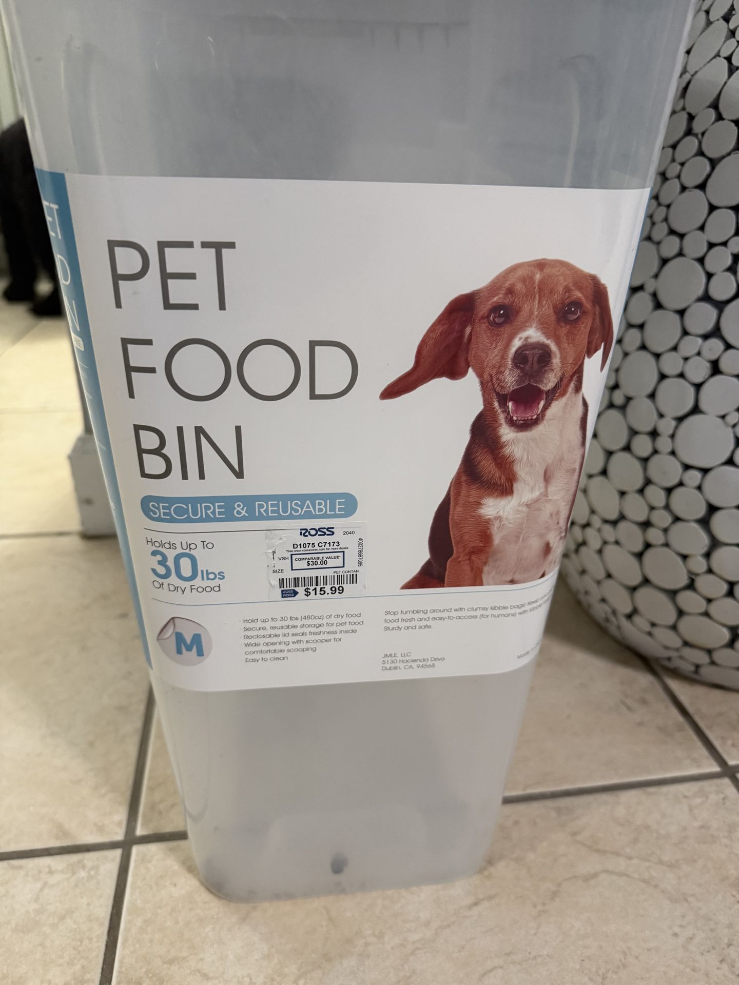 Dog food container stores up to 30lb bag of food