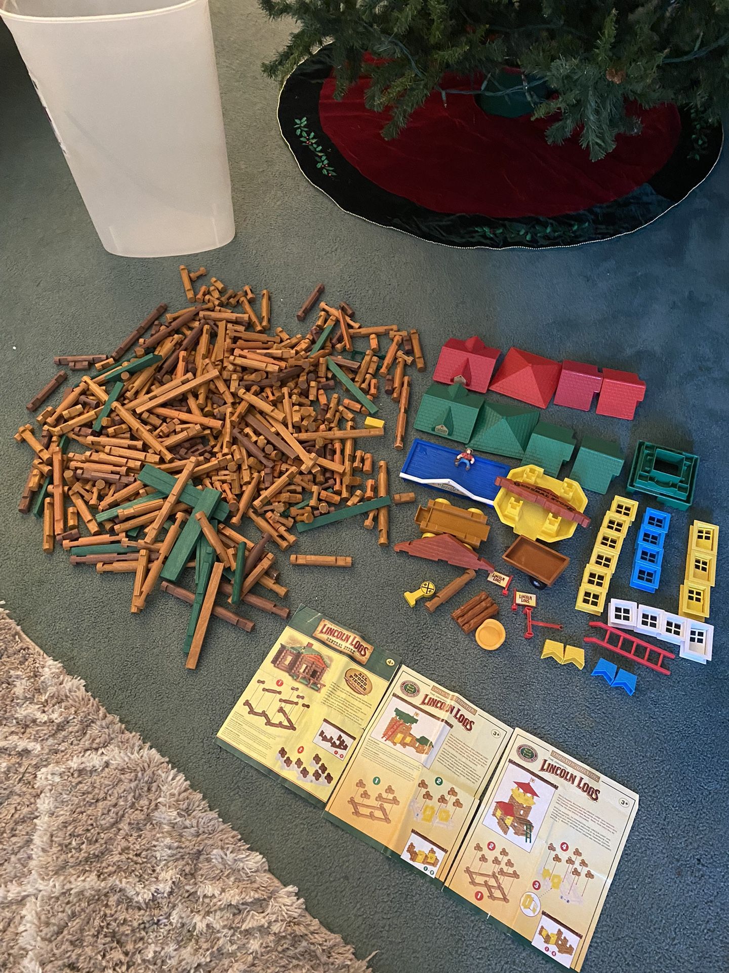 419 Building Logs 46 Accessories 465 Pieces in total!! Lidless container is included, otherwise you can bring your own container to transfer to upon purchase. Minimally used set of lincoln logs, lookin brand new! Includes a wide variety of pieces, let your imagination wander! Includes several getting started guides to walk you through your first projects. Perfect for getting kids off the TV! π