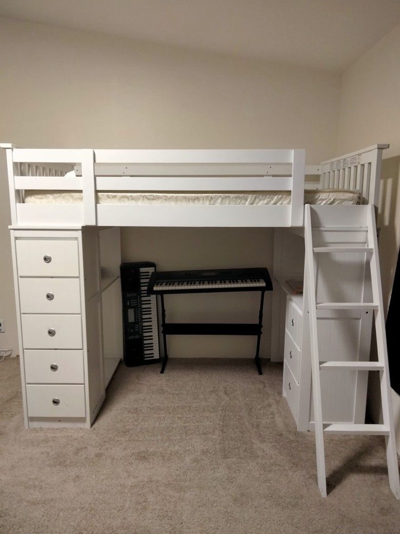 Selling a two-story bed, almost new with drawers. Brought 2 years ago. The shelf on the right can be used as a table. Preferred if you take the mattress as well..