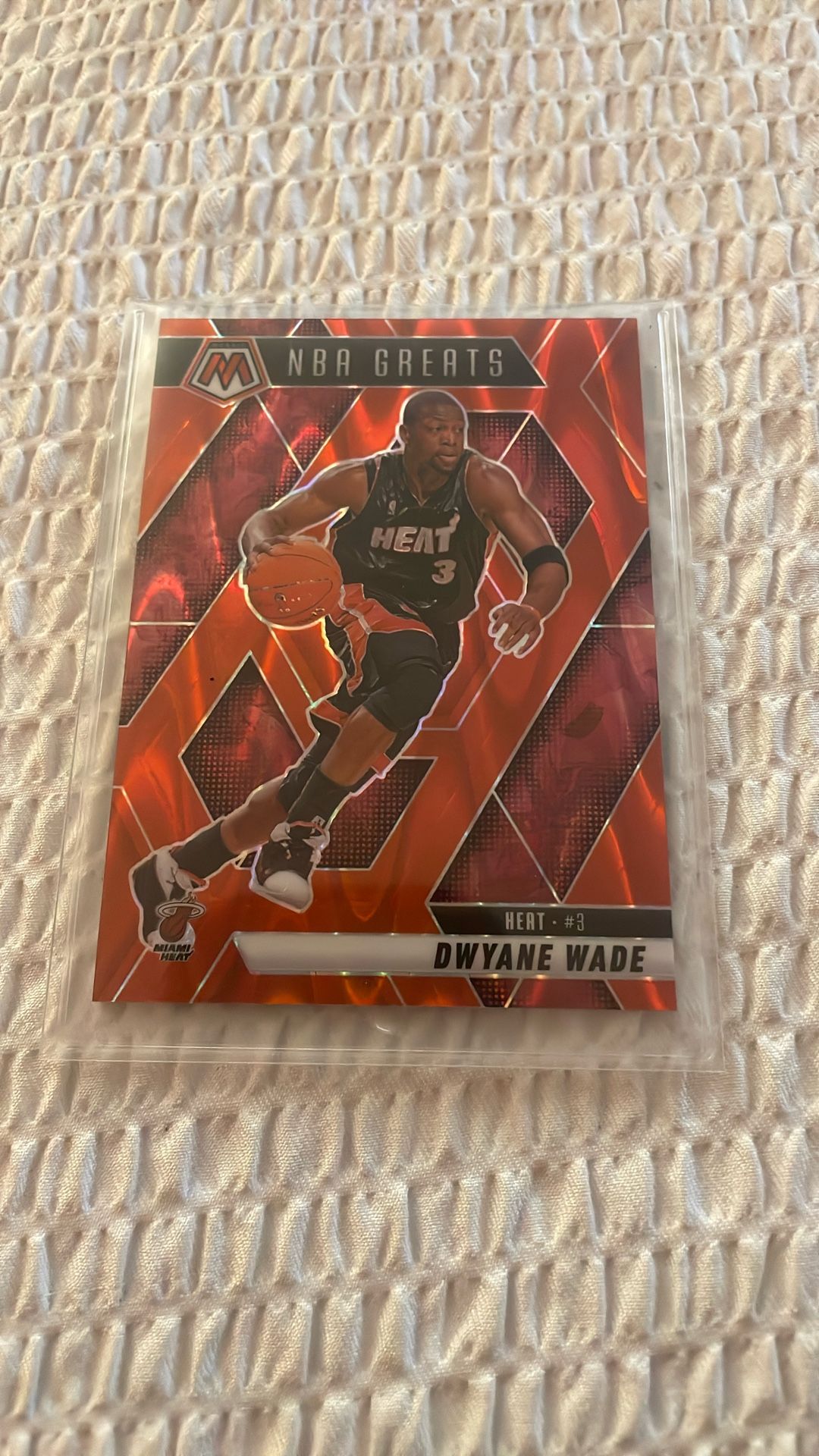 The card you have is a 2024-25 Panini Mosaic NBA Greats Dwyane Wade Orange Mosaic Prizm parallel card. This card is a limited edition item, with a serial number typically found on the back indicating it is one of only 249 produced. Card Information Player: Dwyane Wade Team: Miami Heat Set: 2024-25 Panini Mosaic, NBA Greats insert Parallel: Orange Mosaic Prizm (also known as Orange Reactive) Serial Number: Numbered out of 249 copies Estimated Value The value of this card can vary depending on its condition (ungraded versus graded) and the specific marketplace. Ungraded versions have recently sold in the range of $10 to $25.