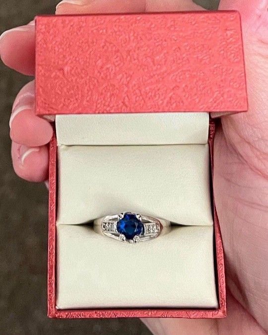 Blue sapphire and cubic zirconia ring set in 925 sterling silver size 8. Brand new in great condition.