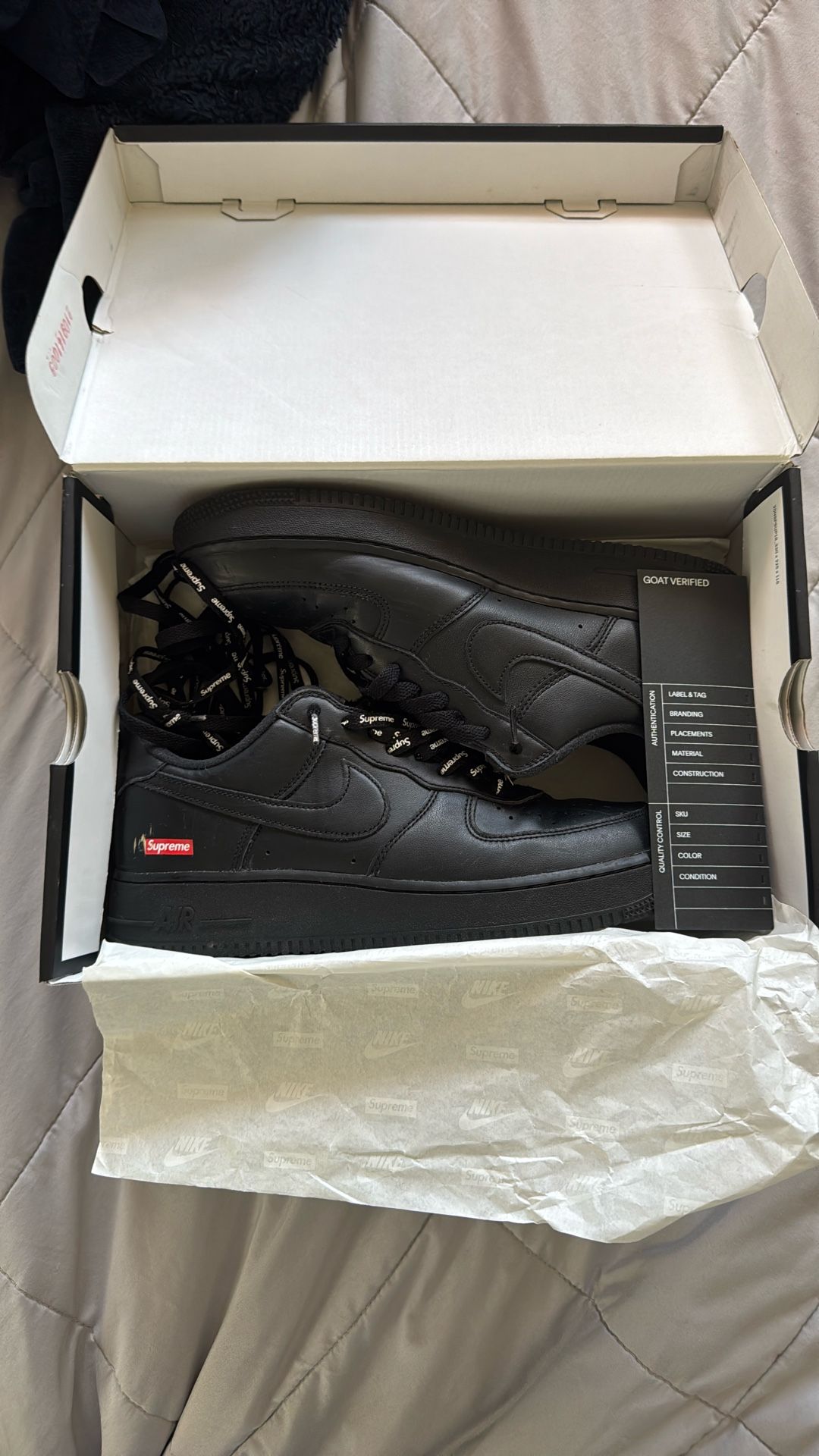 BLACK AIR FORCE 1 LOW SUPREME -USED- MENS SIZE NINE BLACK LACES SUPREME LACES SUPREME NIKE BOX GOAT VERIFIED