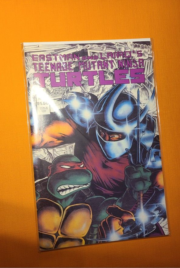 The cover features artwork by creators Kevin Eastman and Peter Laird, showcasing the character Raphael in the foreground and the villain Shredder looming large in the background. The comic is from 1986 and features a wrap-around cover design. The cover also displays the original price of $1.50.