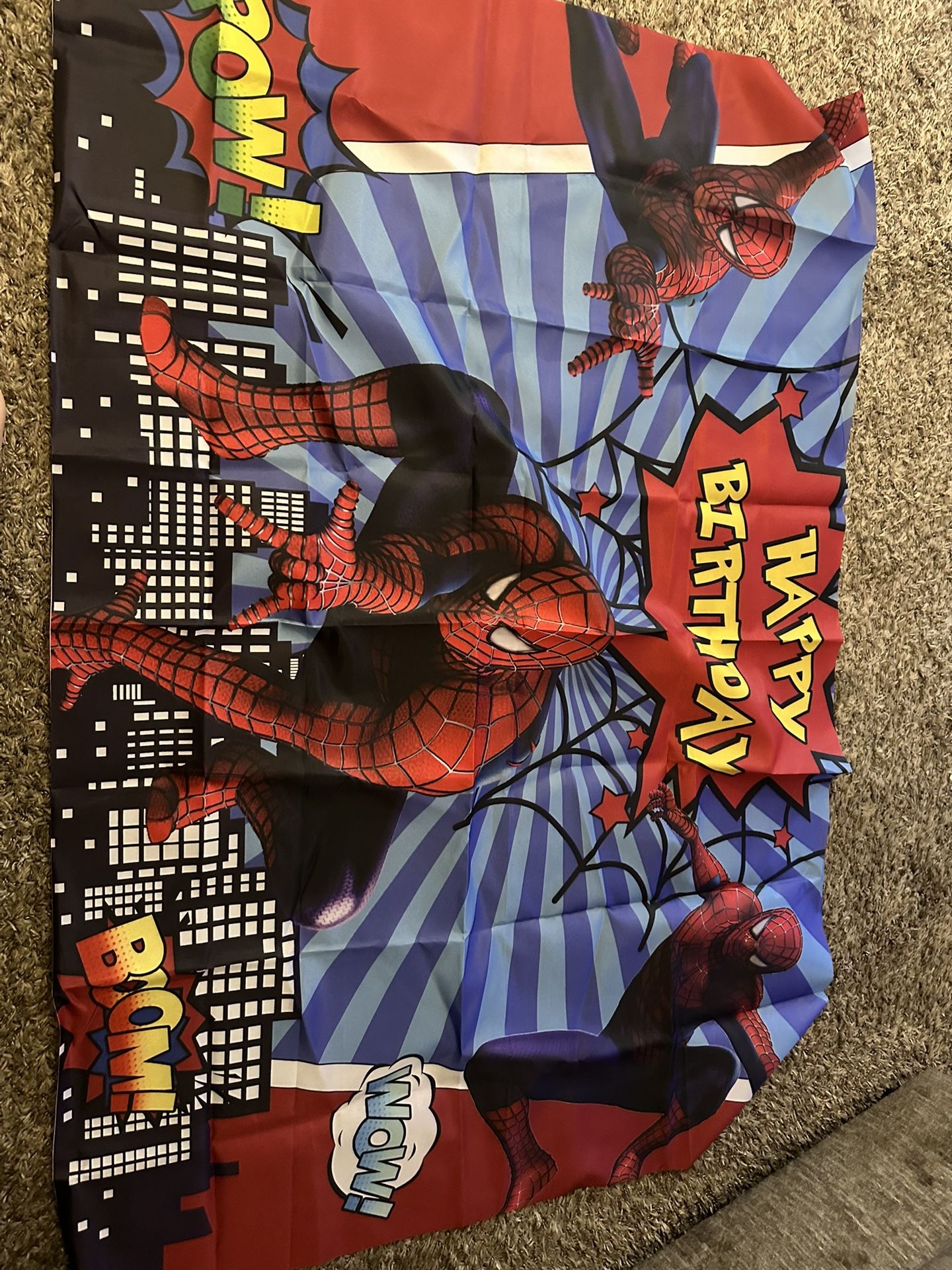 Comes with Spider-Man backdrop spider-Man happy birthday banner plates, cups, napkins and Spider-Man cup cake toppers and Spider-Man balloons and spoons