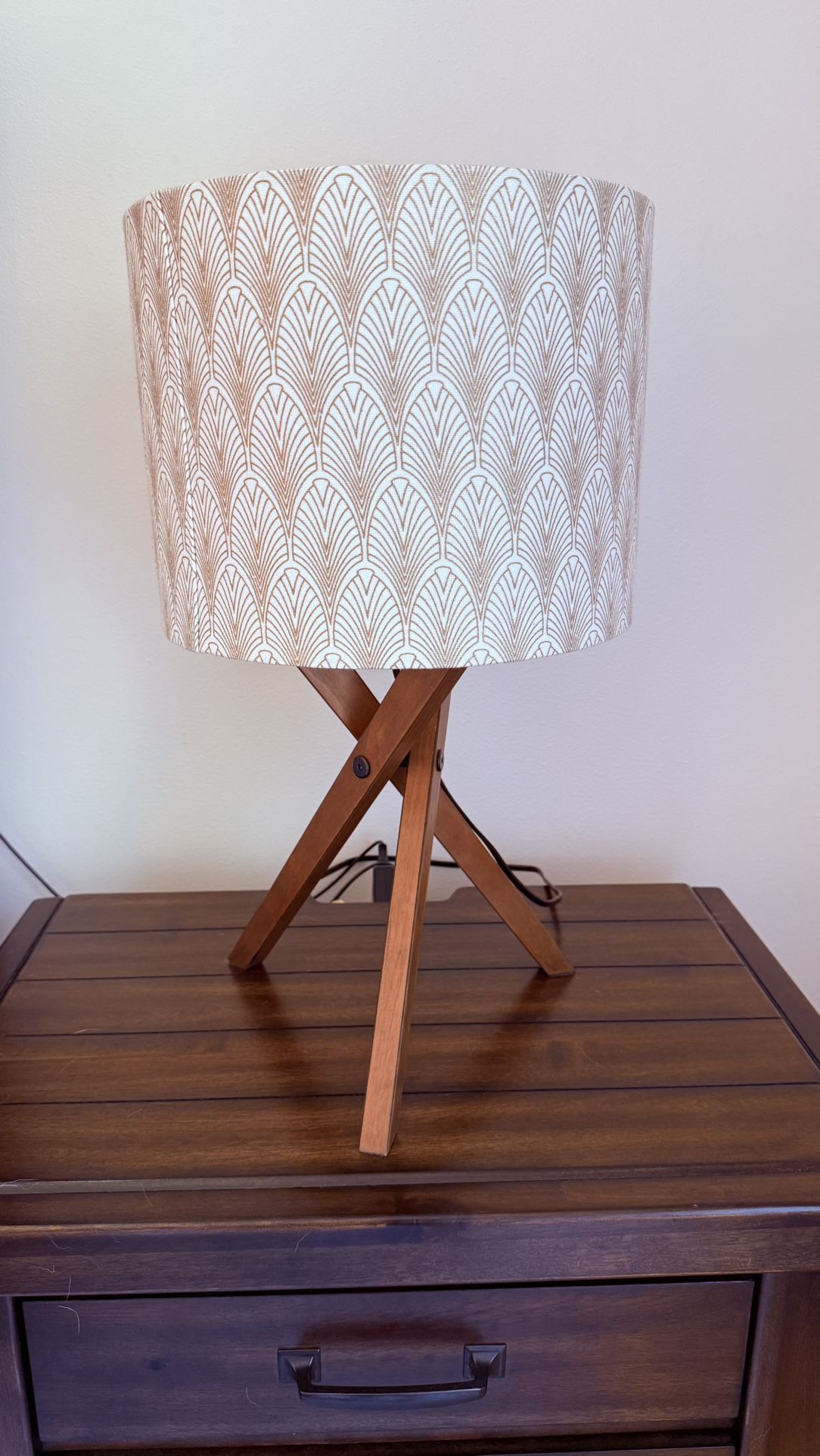 Tripod Bedside Lamp with Walnut Wood Color Light Base & Beige printed Linen Lampshade, Nightstand Lamp for Bedroom, Living Room, Reading Room - World Market $20 each Lightly used, no damage
