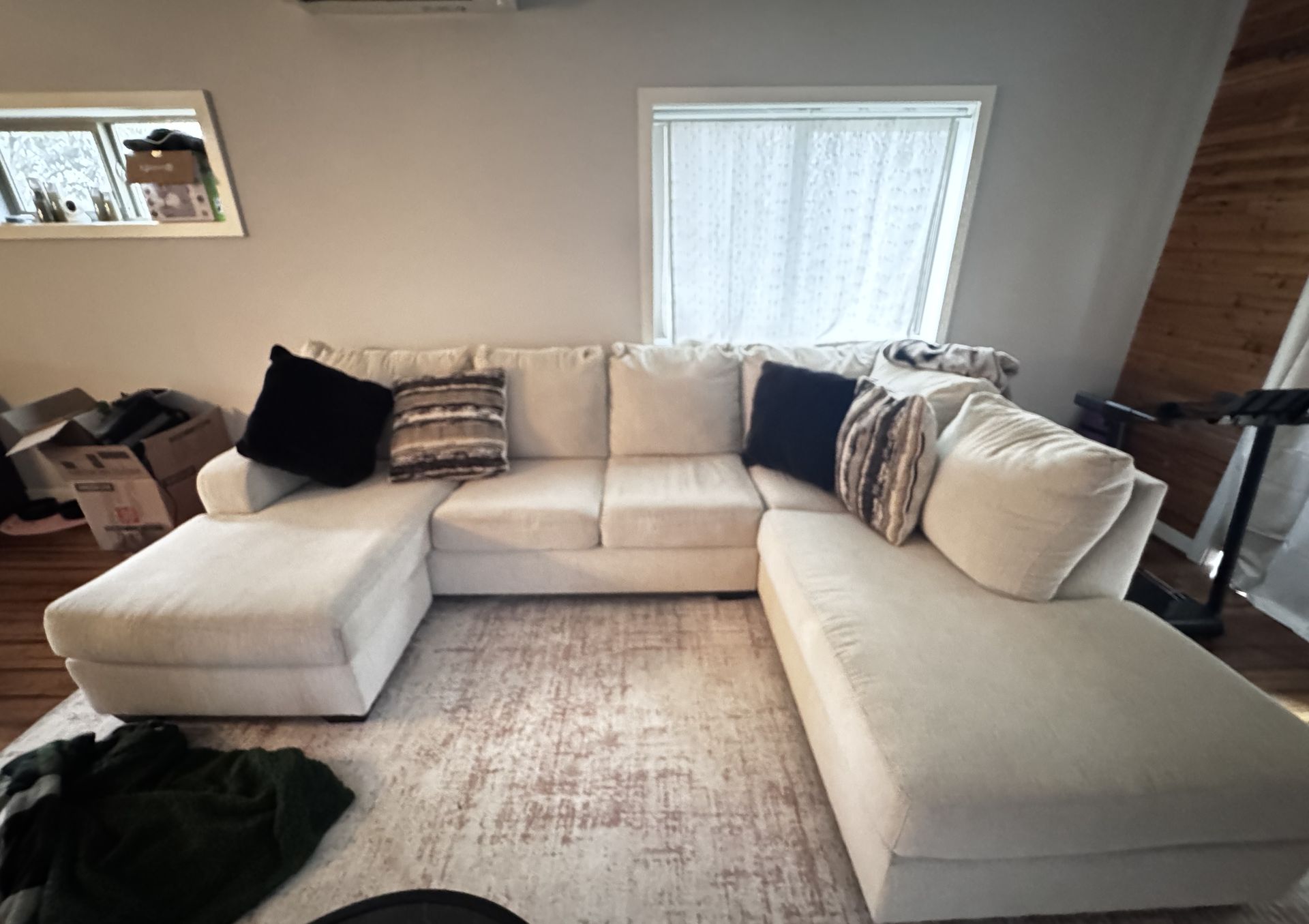 Spacious cream/ivory sectional sofa with a modern, cozy design. This couch has deep seats and plush cushions, making it perfect for lounging, movie nights, or entertaining guests. Pillows included