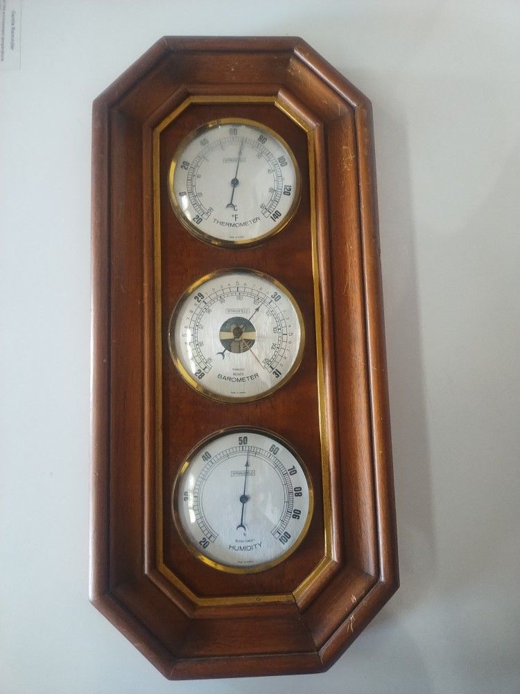 8L x 1.5W x 18H In good condition with wear commensurate with age.. Vintage Springfield weather station barometer featuring a classic design with an easy-to-read dial. Encased in a sturdy frame, it measures atmospheric pressure with precision, reflecting traditional craftsmanship. A decorative piece that captures the charm of vintage meteorological instruments. Pick up only.
