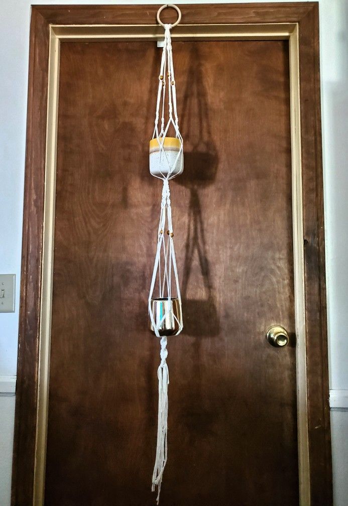 Classic cream macrame plant holder with wood beads. Holds 2 pots (included). Can add small succulent for an additional 3 dollars each. Shipping cost depends on zip code.