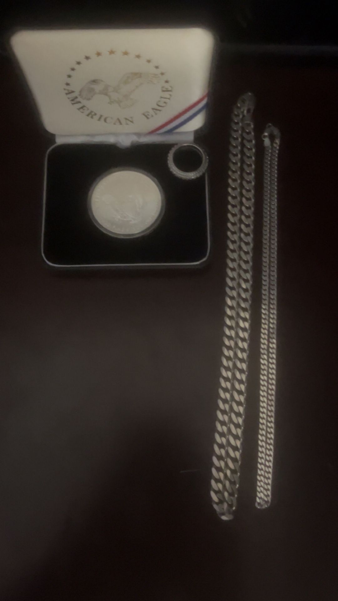 Looking for offers but I’m asking 250 for everything offers are accepted first come first serve shoot offers moisantie ring 925 silver Both chains 925 pure silver Silver coin pure silver