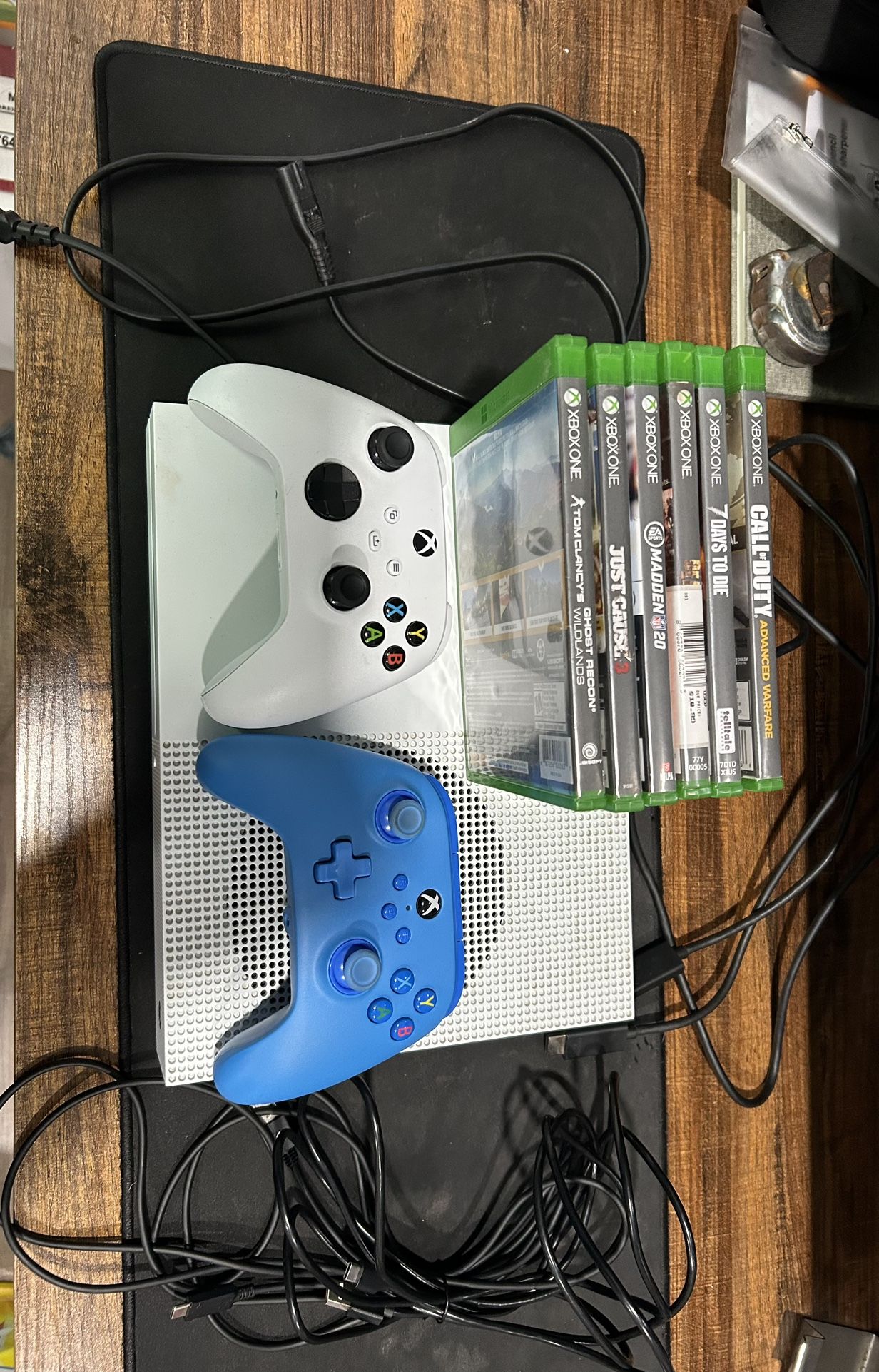Xbox one S, comes with: - 2 controllers (blue one is wired) - Power cord, hdmi, and cord for controller - 6 games, the madden game has far cry 5 instead of madden 20. Need off my hands.