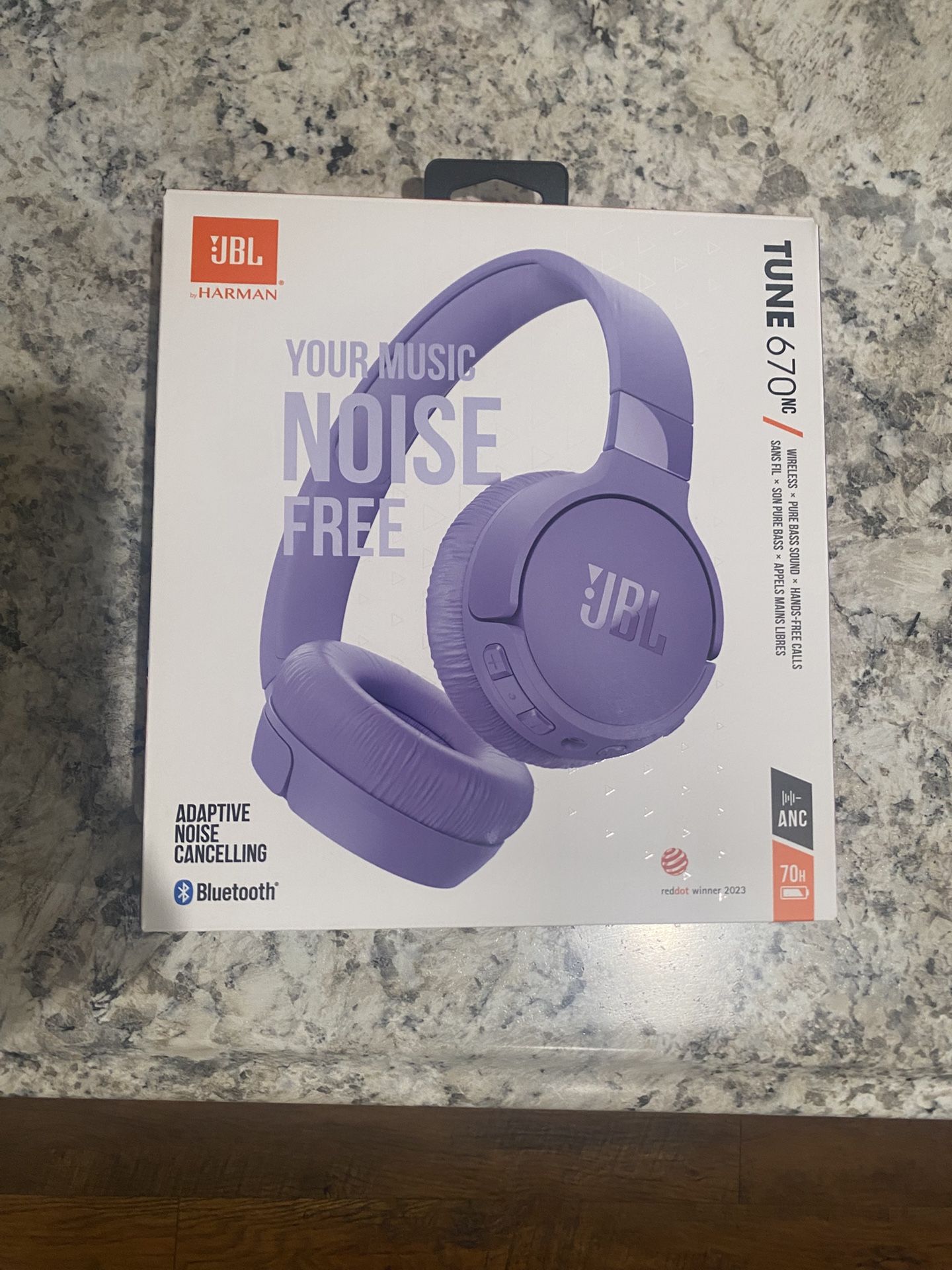 New in box. JBL Tune 670NC - Adaptive Noise Cancelling with Smart Ambient Wireless On-Ear Headphones, Up to 70H Battery Life with Speed Charge, Lightweight, Comfortable and Foldable Design (Purple)