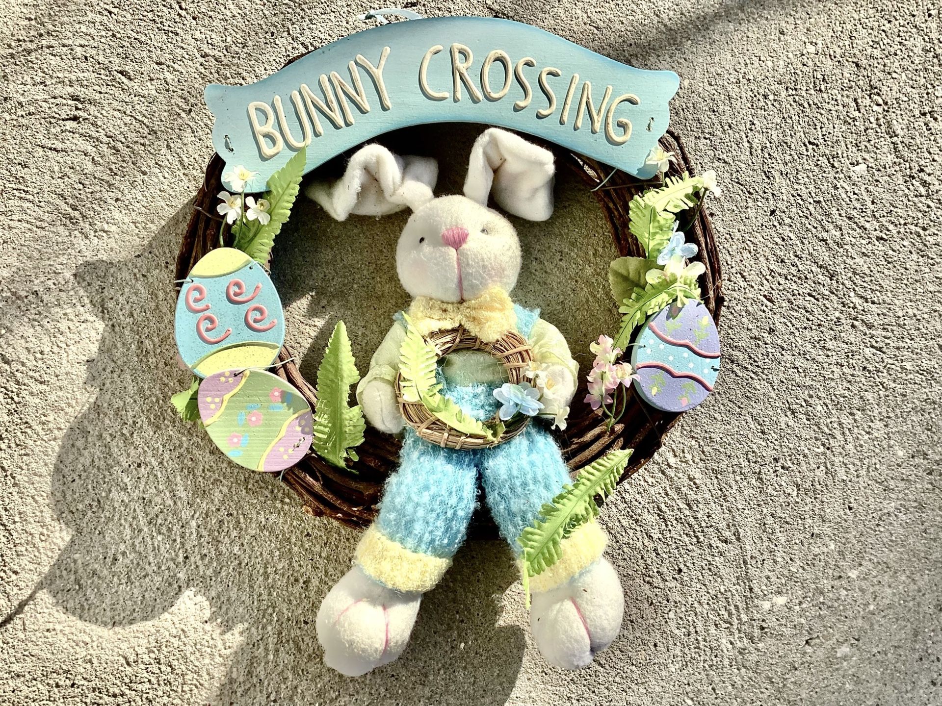 Measuring approximately 13 1/2” wide x 16” tall, this DanDee Collector’s Choice Easter wreath is the perfect Holiday or Springtime decor. Features a soft white plush Bunny wearing a pastel green shirt and blue overalls. He is perched on the frame and holding a small wreath. Rustic twig round frame that is accented with wooden cut-out painted Easter eggs and fabric flowers and fern. Top wooden banner reads, “Bunny Crossing.” Ideal for door or wall hanging. Made in the USA. Farmhouse-style. Preowned in very good condition. Very slight signs of wear and age. Comes from a smoke and pet free environment. Cash only. Pickup in New Hyde Park, Nassau County, Long Island, New York 11040.