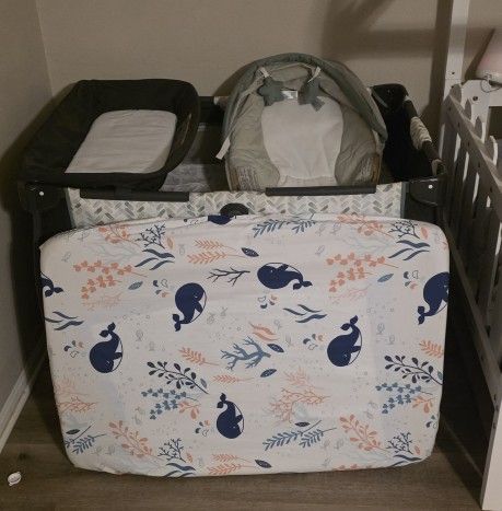 Lightly used , no stains. Comes with additional matress and extra sheets. As seen in picture has changing table and basinet attachment option. Ended up co sleeping so it didnt end up getting used .