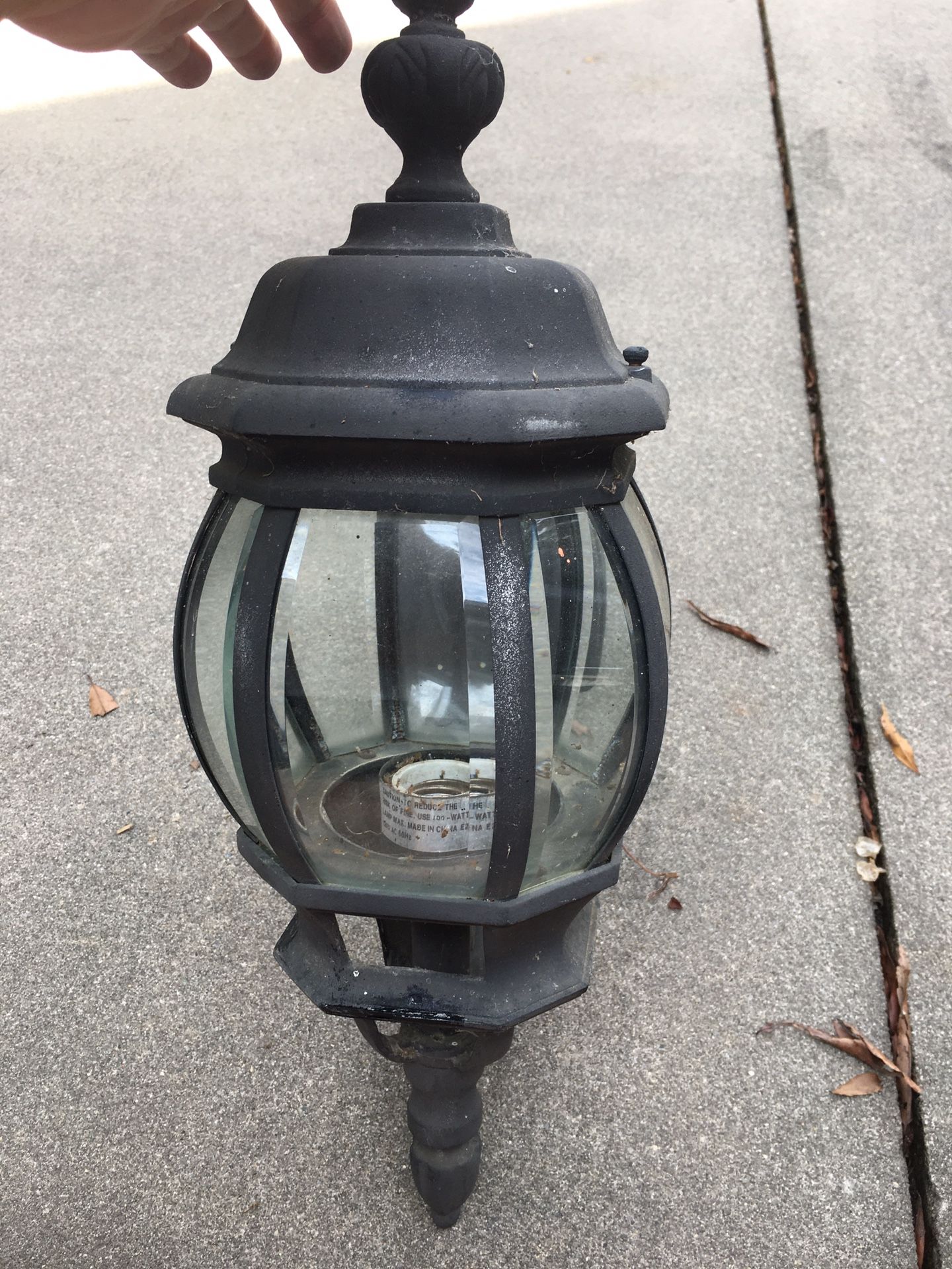 Used black wrought iron outdoor fixture. Uses 1 light bulb. Works fine - just changes our outdoor fixtures. Must be able to do a porch pickup near Elon, NC.