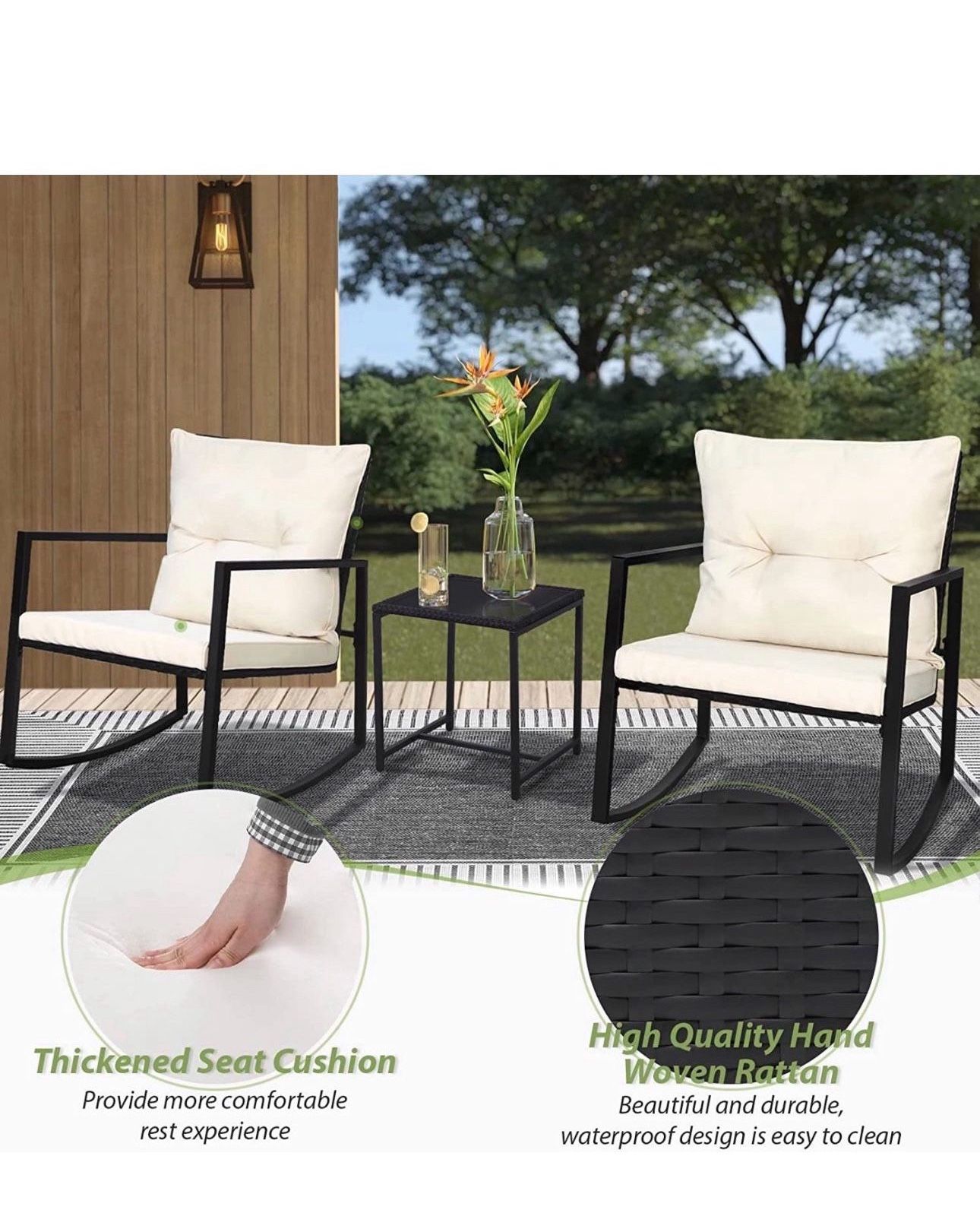 Outdoor 3 pieces bistro set rocking chairs black wicker furniture with 2 chairs and 1 coffee table glass table with 4 cushions beige