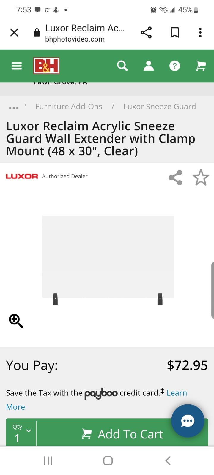 Acrylic Covid-19 see thru barrier. Perfect for business , church or home. 48 x30 with table clamps. Still in cardboard box from manufacturer. Please compare to online Amazon pricing. Can also be used for crafts displays. Will lower price for multiple items sale