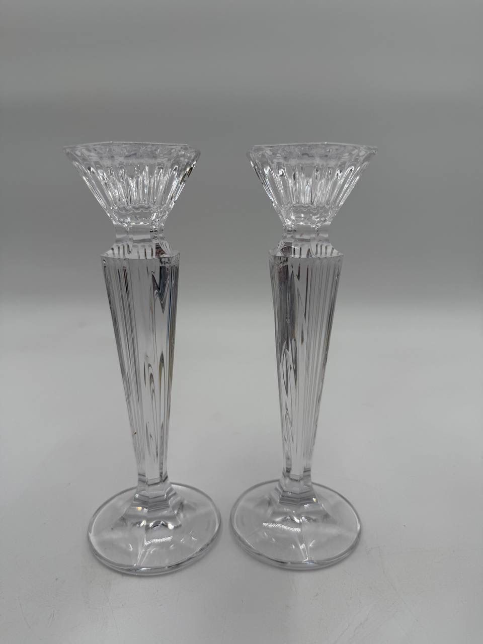 This set of 2 Marquis Waterford Festival 6" Light Candlestick Candle Holders is a luxurious and elegant addition to any room. Made of crystal clear glass, these candle holders exude a mid-century modern style and are suitable for taper/dinner candles. The Waterford brand ensures high quality and craftsmanship, making them an original and exquisite giftware piece. Perfect for the holiday season or any special occasion, these candle holders bring a touch of luxury and sophistication to your decor. Made in Ireland, these candle holders are a vintage-inspired piece that will enhance any space with their timeless design.