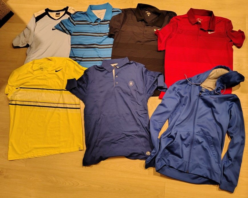 Nike men's athletic tennis shirts Size medium in the Nike shirts Adidas jacket is blue Tennis Hall of Fame blue shirt medium Selling them individually, $20 for each shirt