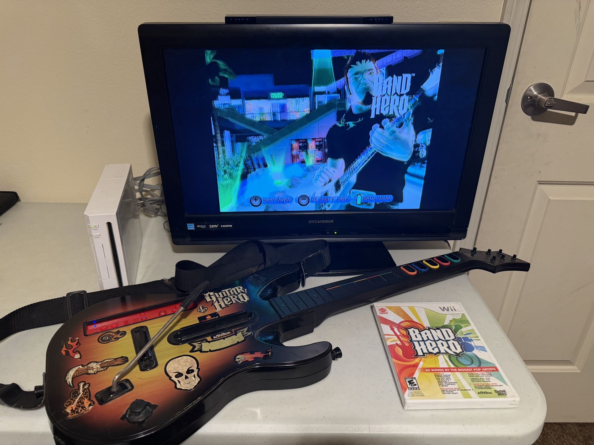Nintendo Wii comes with all cords, 1 controller, Guitar, and band hero game. Everything has been tested and works great asking $ 180. Also check out the other video game stuff I have for sale by clicking on my profile. Will also trade for other video game stuff like Original Nintendo , Nintendo 64 , Super Nintendo, GameCube , Playstation 1 2 3 4 , SEGA , Gameboy , Nintendo DS , Wii , Wii U ,Xbox , Xbox 360 , Xbox one , psp , Rockband Sets , Guitar Hero Sets, Etc ...