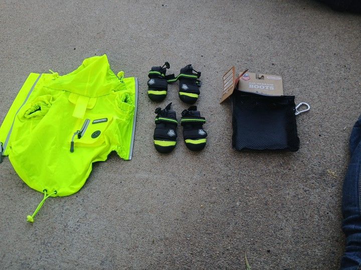 Arcadia Trail windbreaker xs and all terrain boots xs/s. Never used. Too small for 25 lb chihuahua. Selling set for 30.00. Will sell separately. Boots retail for 31.99 asking 18.00. Windbreaker retails for 29.99 asking 12.00.
