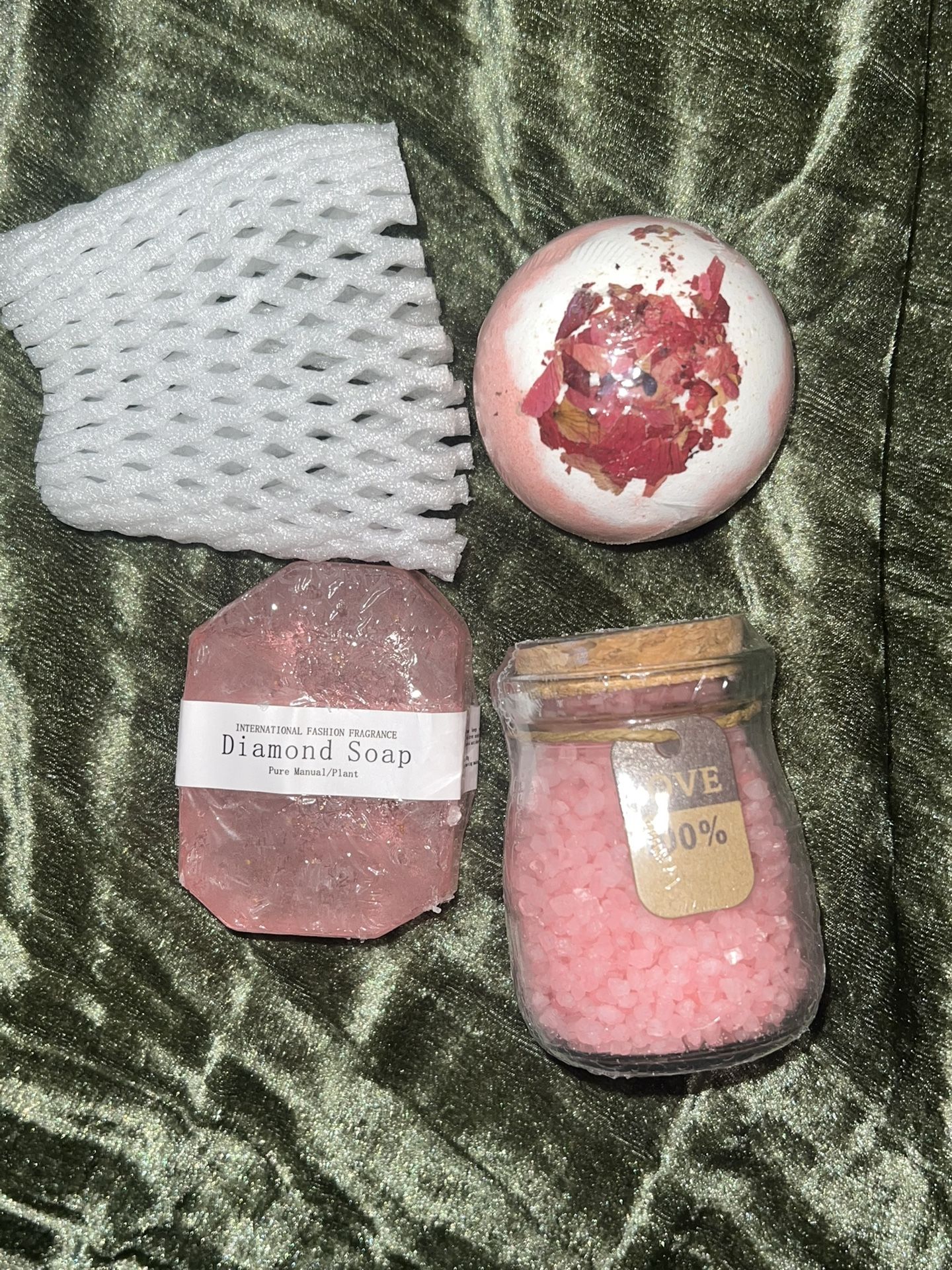 ! no shipping ! cash or zelle brand new & completely unopened. minor tear in bathtub plastic in front of petals so some petals had fell out but the remaining petals are shown in picture. diamond soap is plant based