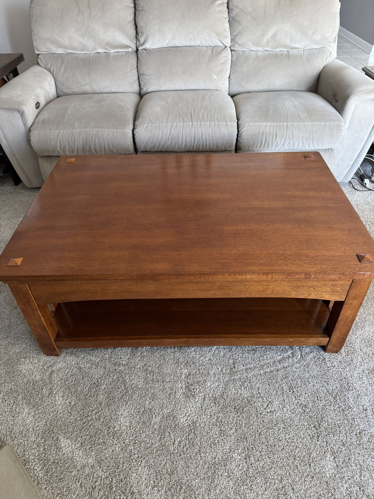 Schnadig vintage mission-style lift top all wood coffee table in good condition with a few minor marks. Coffee table top easily lifts to provide height for eating/working while sitting on sofa or chair. 48 inches in length by 32 inches wide by 18 3/4 inches in height in non- lift position. Table top 25 inches in height in lift position.