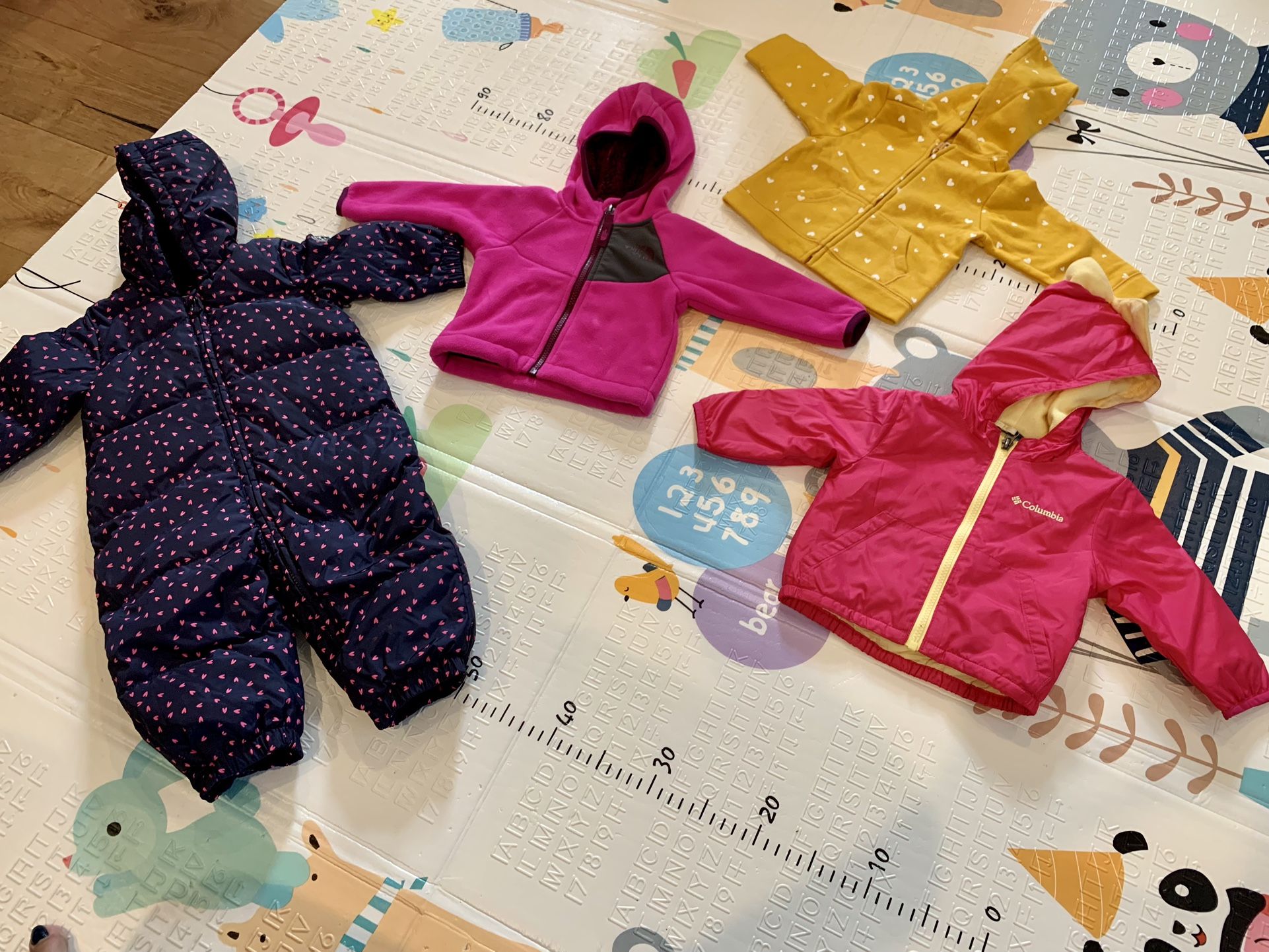 Gap snowsuit 12-18 m The North face fleece cozy jacket 3-6 m Old navy jacket yellow 6-12m Columbia jacket - Pink with yellow inside 6-12m All jackets almost new. You will not regret this buy. Super clean, washed only once after first use. Some of them not even wore once. From clean and smoke free house. Washed in plant based laundry detergent. Cash only.