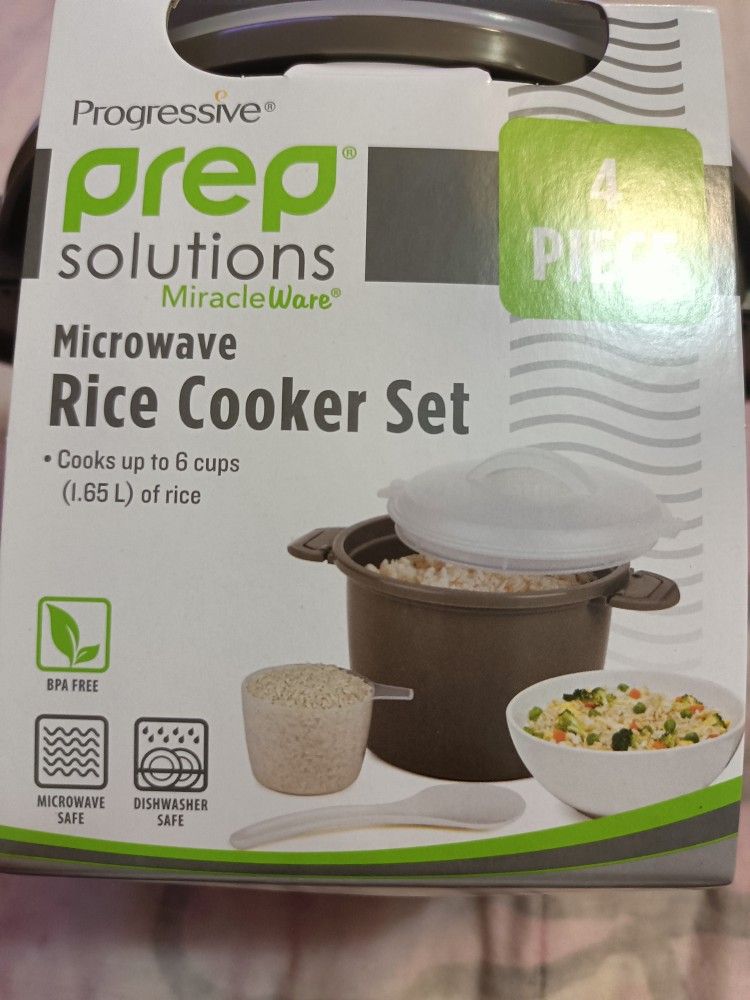 Brand New Microwave Rice cooker set comes with serving spoon and measuring cup. Cooks up to 6 cups of Rice
