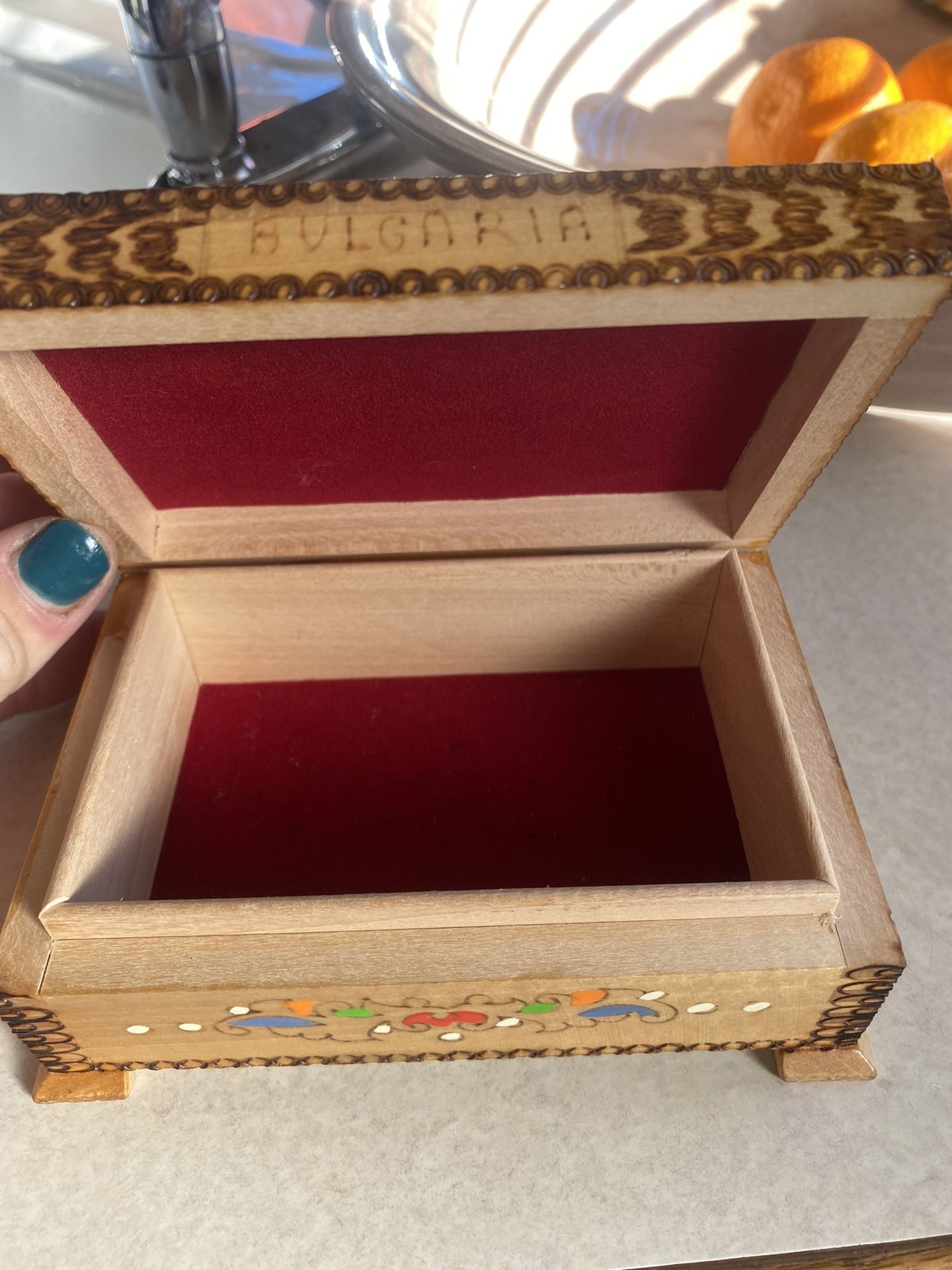 Hand carved Bulgarian box lined with red velvet in perfect condition