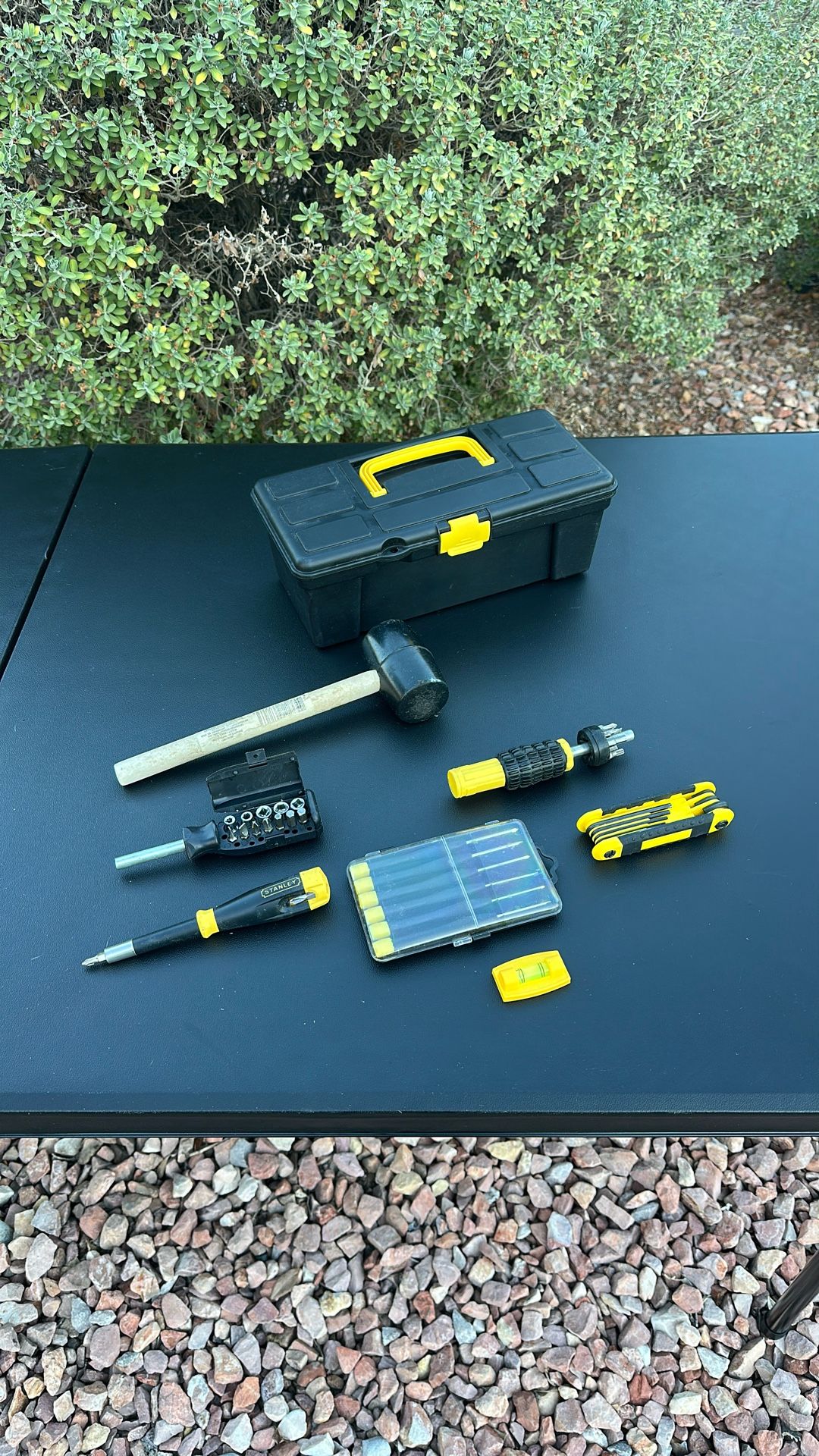 Set of 8 homeowner's tools from the Stanley brand & others in a black plastic tool case - used - in great condition. It is a general-purpose set designed for basic home repairs and DIY projects. This set includes a variety of hand and mechanics tools. The tools come in a sturdy, blow-molded case for convenient storage and portability. The tools are durable and comfortable to use, with features like non-slip grips. kit. This set is designed for general-purpose repairs around the home, office, or vehicle. The yellow and black color scheme is characteristic of the Stanley brand. Key Details Brand: Stanley also other brands Case: Comes in a compact, durable black plastic case for easy storage and portability. Contents: This type of tools set include a mix of essential hand tools for various tasks. It contains a tool box, one set of 6 screwdrivers, one hammer, three types of screwdrivers with different ends, folding hex key set & a mini bubble level.