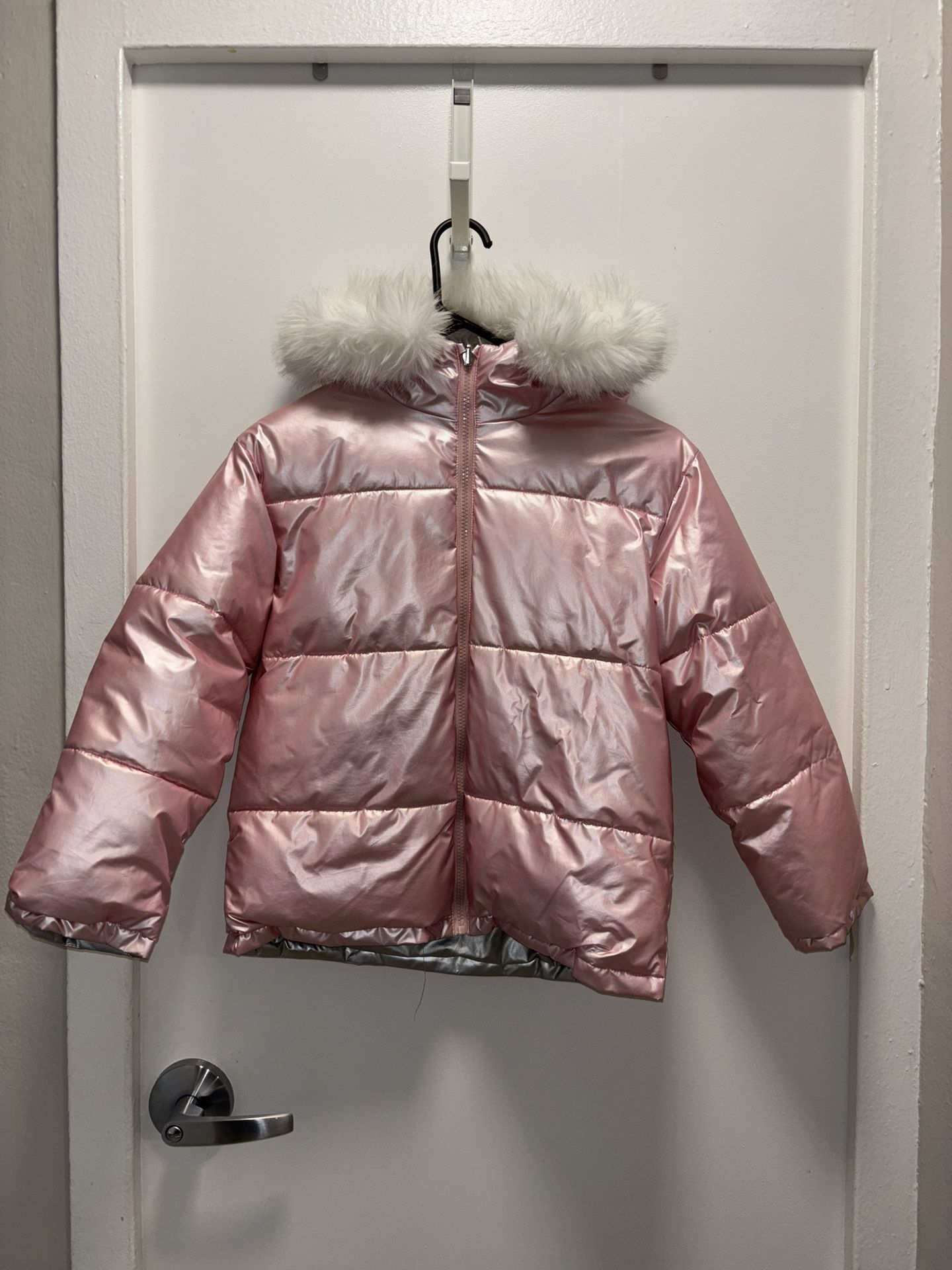 This reversible puffer coat is perfect for staying warm and stylish. It features a metallic pink exterior and a silver interior, both with a shiny finish. The hood is trimmed with fluffy white faux fur. Made for keeping cozy! Girls Size 11.