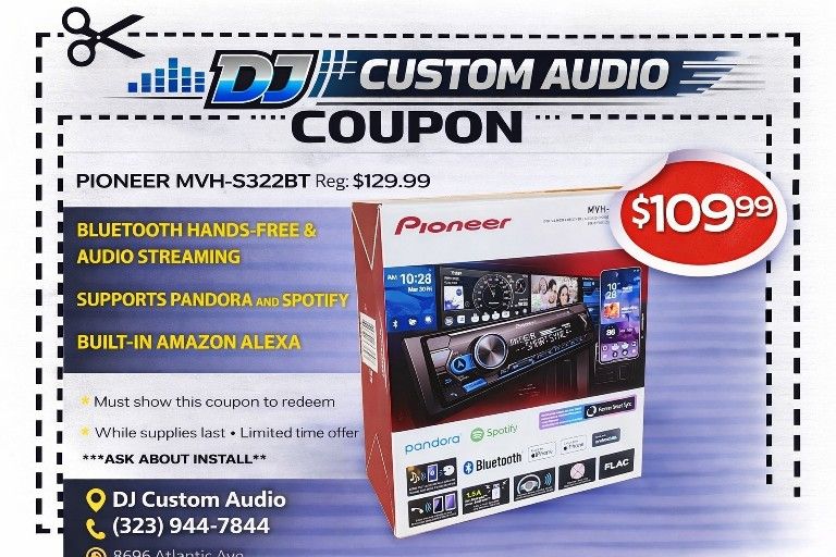 🎵 We carry top brands: Kicker, JL Audio, Alpine, DB Drive, Alphasonik, JBL, Hifonics, Pioneer, Jensen, JVC, Boss Elite, Focal, SounDigital, AudioControl, Infinity, Metra, PAC, Viper, Stinger, Axxess, Aunex, MTI Acoustics, Crunch, Musway and more! 🔧 Professional installation available – stereos, subs, amps, alarms & more (even if you already have your own equipment). Installation cost is separate, not included in product price. 💳 Financing available – take it home today with easy weekly, bi-weekly, or monthly payments: 👉 American First Finance: Text APPLY to 41806 (no credit needed, just ID + checking account). Be sure to select our store DJ Custom Audio in the store search option. 👉 Snap Finance: Text 9456 to 48078 and get the application sent directly to your phone (no credit needed, just ID + checking account). 👉 Synchrony Home: 6–12 months no interest (requires an actual credit check; application must be completed in-store or by email only). 📲 Call: (323) 944-7844 📍 DJ Custom Audio – South Gate (Firestone Blvd) 8696 Atlantic Ave South Gate CA 90280 ⚡ Special Offer: Discounted OfferUp pricing is only valid when you mention or show this ad at the time of purchase. --------‐----------------------------------------------------------------------‐-------------------------------------------------------------------------------------------------------------------- 🔧 Instalación profesional disponible – estéreos, bajos, amplificadores, alarmas y más (aunque ya tengas tu propio equipo). El costo de instalación es aparte, no está incluido en el precio del producto. 💳 Financiamiento disponible – llévatelo hoy con pagos semanales, quincenales o mensuales: 👉 American First Finance: Envía la palabra APPLY al 41806 (no se necesita crédito, solo identificación + cuenta de cheques). Asegúrate de seleccionar nuestra tienda DJ Custom Audio en la opción de búsqueda. 👉 Snap Finance: Envía el número 9456 al 48078 y recibe la aplicación directamente en tu teléfono (no se necesita crédito, solo identificación + cuenta de cheques). 👉 Synchrony Home: 6–12 meses sin interés (requiere verificación de crédito; la aplicación se completa solo en la tienda o por correo electrónico). 📲 Llama: (323) 944-7844 📍 DJ Custom Audio – South Gate (Firestone Blvd) 8696 Atlantic Ave South Gate CA 90280 ⚡ Oferta especial: Los precios con descuento en OfferUp solo son válidos cuando muestras o mencionas este anuncio al momento de la compra.