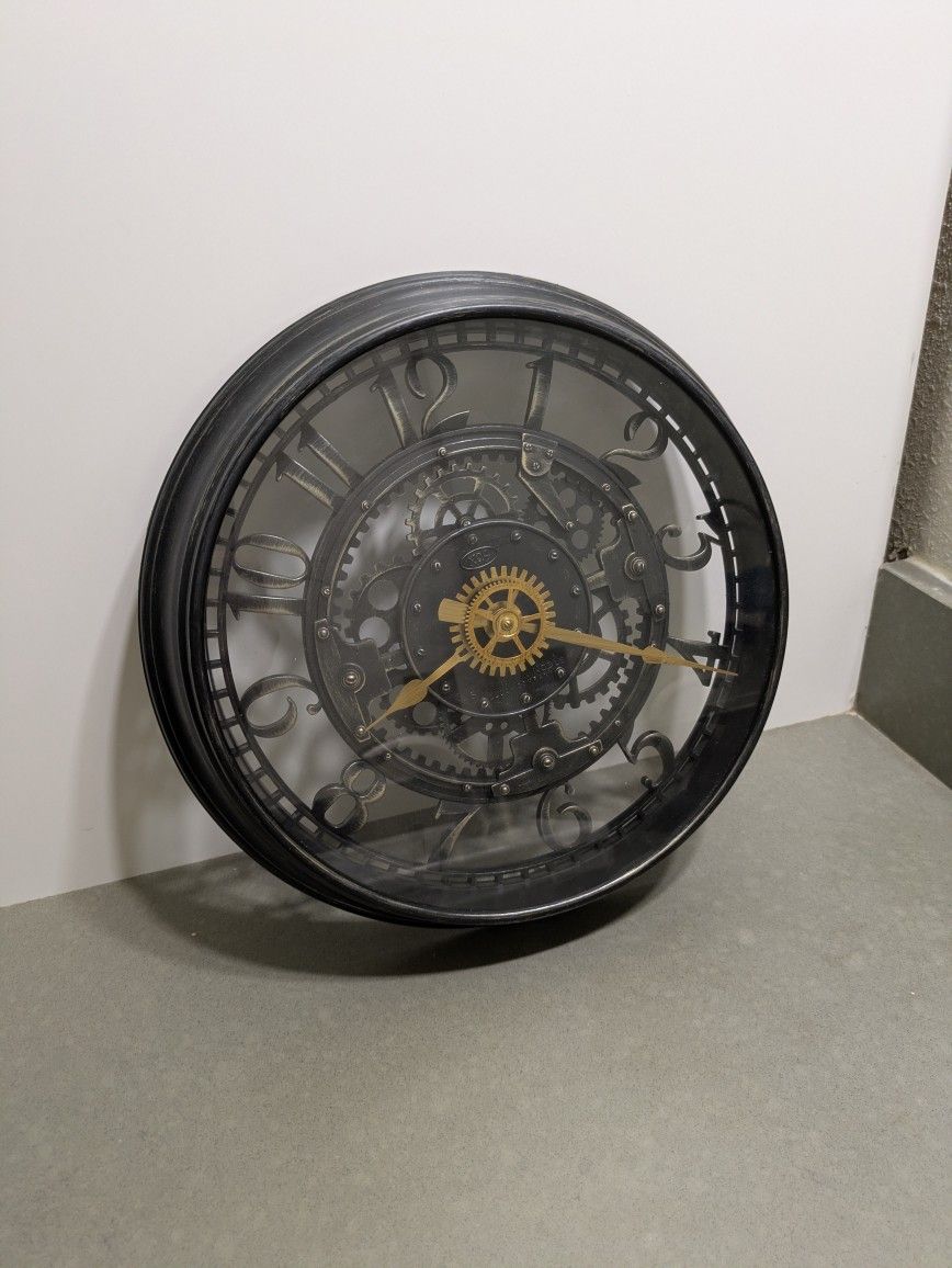 This is a Mainstays Indoor Round 11.5" Oil Rubbed Bronze Cutout Gear Industrial Analog Wall Clock. Features a hand-applied oil-rubbed bronze finish and an industrial, steampunk-inspired design. The dial has bold Arabic numerals and a cutout, skeletal effect that showcases decorative gear elements. It uses quality quartz movement for precise timekeeping and operates on one AA battery. A glass lens protects the clock face and hands.