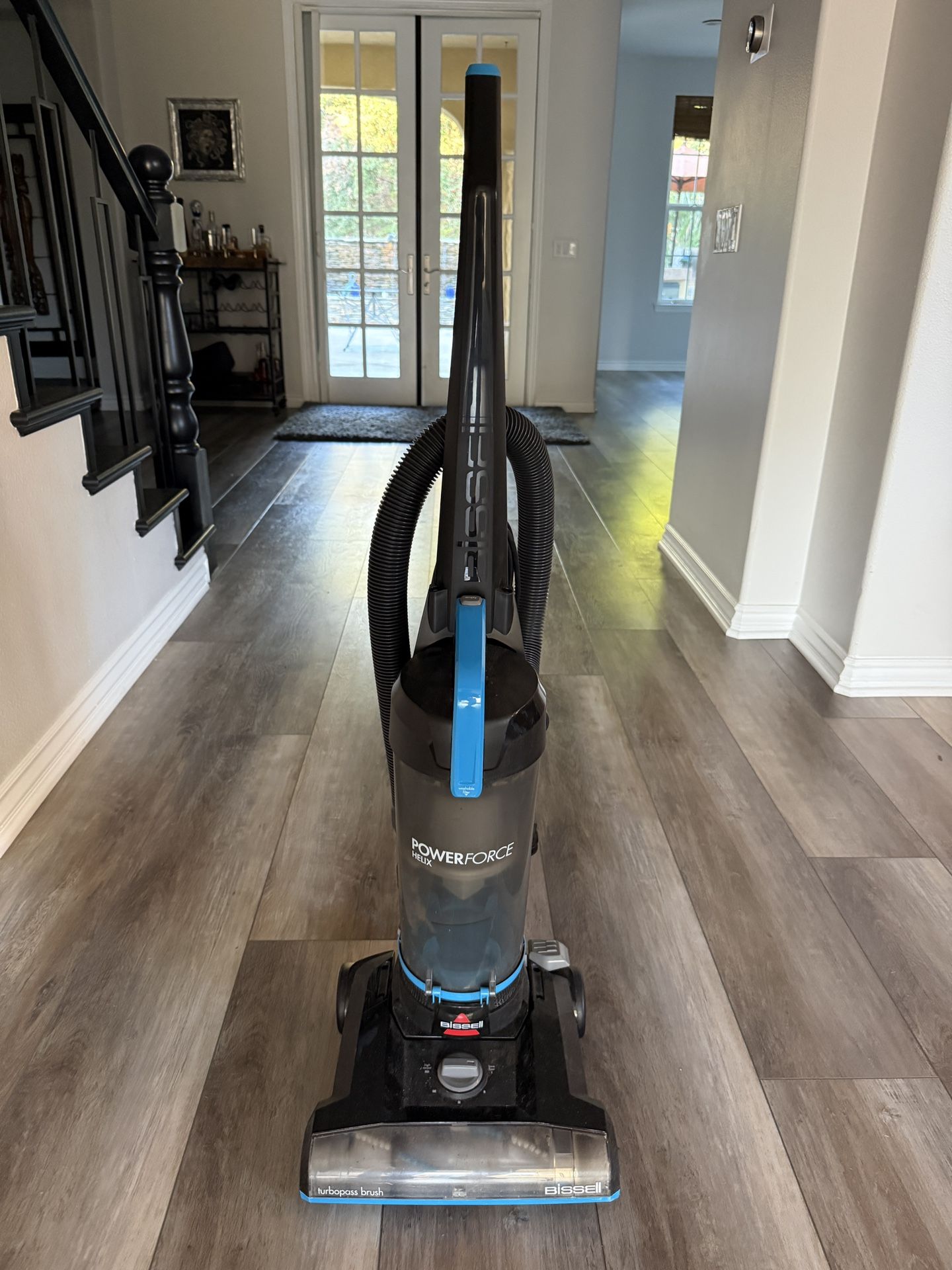 Bissell power, force, compact, Bagla, upright vacuum. Lightweight. Powerful suction. High reached wand. Hard floor and carpet. Equipped with a washable filter. 18 foot cord.