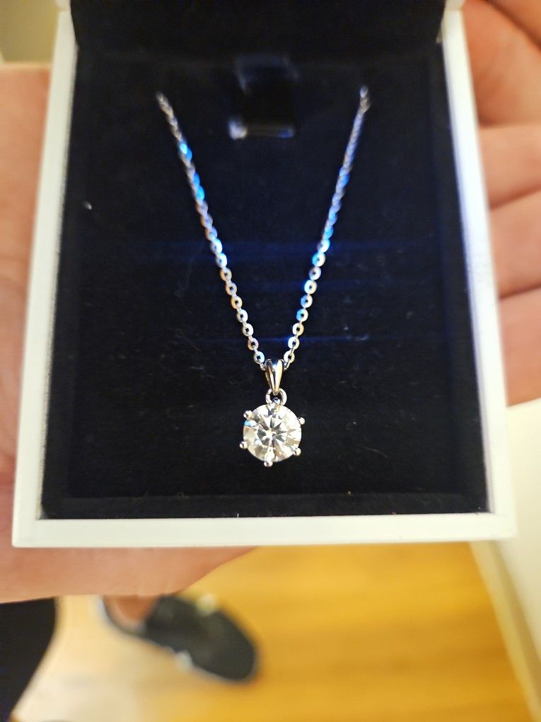 2 carat VS2 clarity, color scale I. Circle cut. On sterling silver chain. With light up Box. This diamond is beautiful it retracts light and has the fire brilliance that everyone is looking for. You can definitely come check in out before sale.