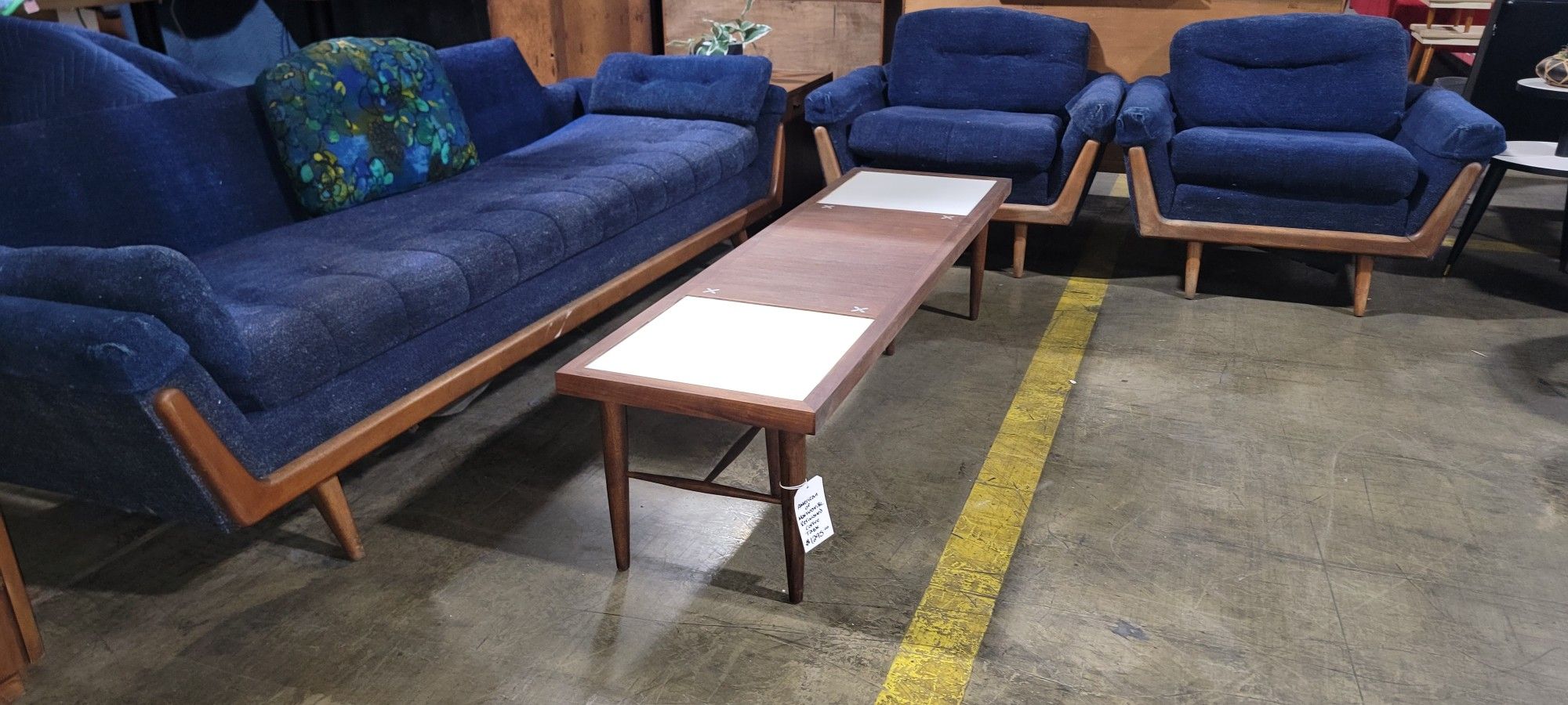 Mid Century Coffee Table by Merton Gershun for American of Martinsville Elevate your space with this exquisite vintage coffee table designed by Merton Gershun for American of Martinsville. This piece showcases a beautiful walnut wood grain, complemented by striking white accents that add a modern flair and unique character. The table features a classic white ‘X’ inlay paired with chic white laminate squares, perfect for showcasing your cocktails or decor. Professionally refinished to preserve its charm and enhance its beauty, this coffee table is both stylish and functional. Shipping is conveniently included within a one-hour drive of Jeannette, PA (15644). Explore our extensive collection of mid-century modern furniture across two fully stocked warehouses! Don’t miss out—text or call Adam at (contact info removed) to arrange a viewing. **Dimensions:** - Width: 60 in - Height: 15 in - Depth: 17 in Transform your living space with this timeless piece!