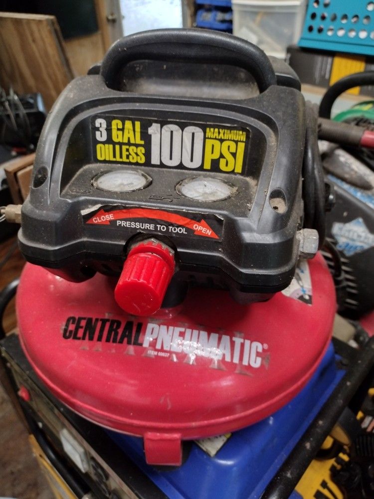 Central pneumatic 3 gallon oil less compressor. 100lb maximum. Working fine. On and off switch broke so is wired straight without a switch now. Switch should be easy to replace. Got a larger one so I don't need this size.