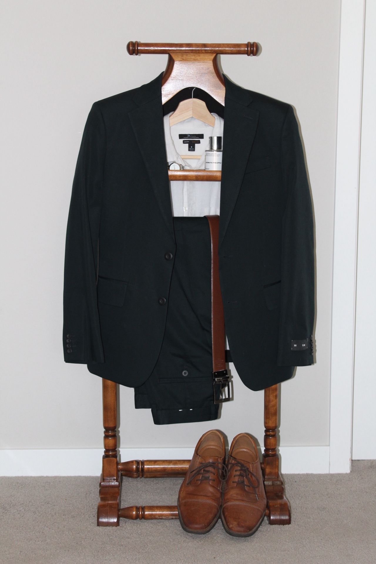 Valet Stand for wardrobe decor, Wedding/Event photos, bedrooms and closets! features a sturdy hanger for jackets or suits, a trouser bar, and a convenient tray for accessories or cufflinks. Perfect for organizing your daily essentials while adding a touch of timeless sophistication to your bedroom or dressing area. Lightly used and in excellent condition. *obo will deliver locally for a fee *cash or venmo only height - 44 in width - 14 in length - 17 3/4 in