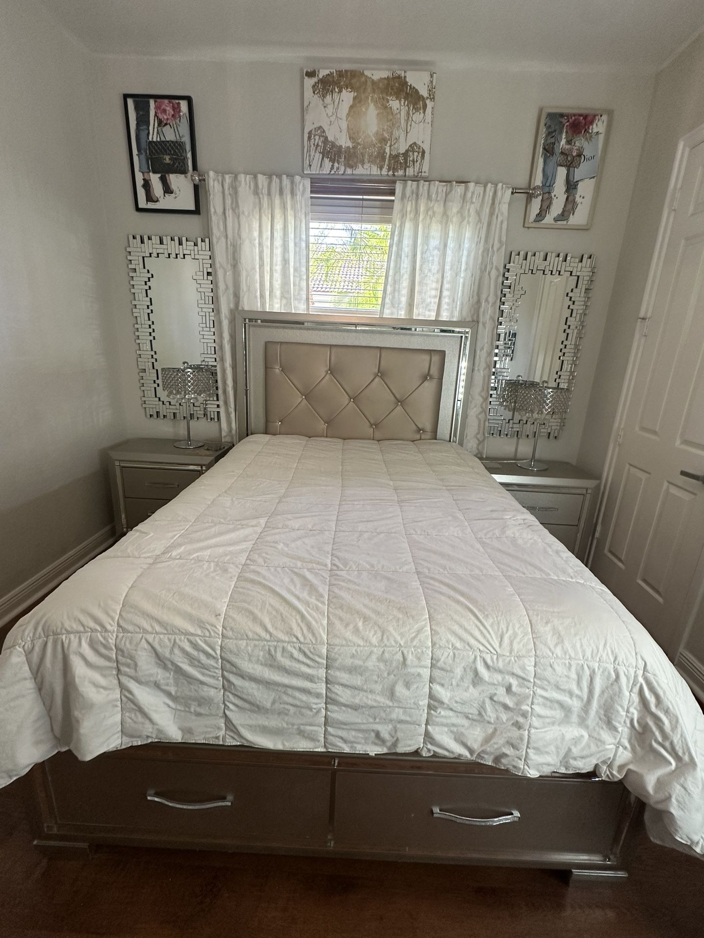 Complete Queen bedroom set includes, Queen headboard, platform, footboard with 2 draws, 2 night stands, dresser & lighted mirror. A few damages on surface of furniture as shown. Solid wood construction. Bought this at City Furniture. Hdbd ; 64”w x 92”L N/ stands ; 27”w x 18”d Dresser ; 63” w x 18” d Sold as is.. Available for pick up in Davie, Fl.