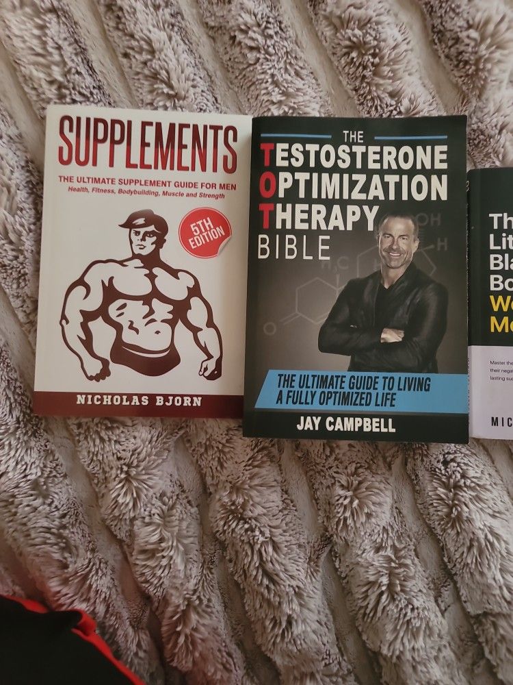 3 educational books for people interested in supplements, testosterone and motivation to work out! Very informative and helpful for serious gym personal! Like new, no torn pages or missing pages! CASH ONLY! 10 DOLLARS! NO electronic transfer, credit card, checks!! CASH ONLY! NO SHIPPING MUST PICK UP!