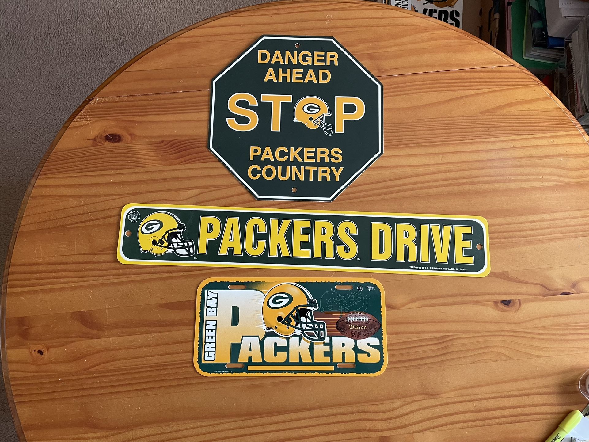 Home Office Bar Decorations Plastic Stop Sign 12x12 “Danger Ahead / Packers Country”, plastic Street Sign“ Packers Drive” 4x24 & Plastic License Plate 6x12. Never used. Condition - very good.