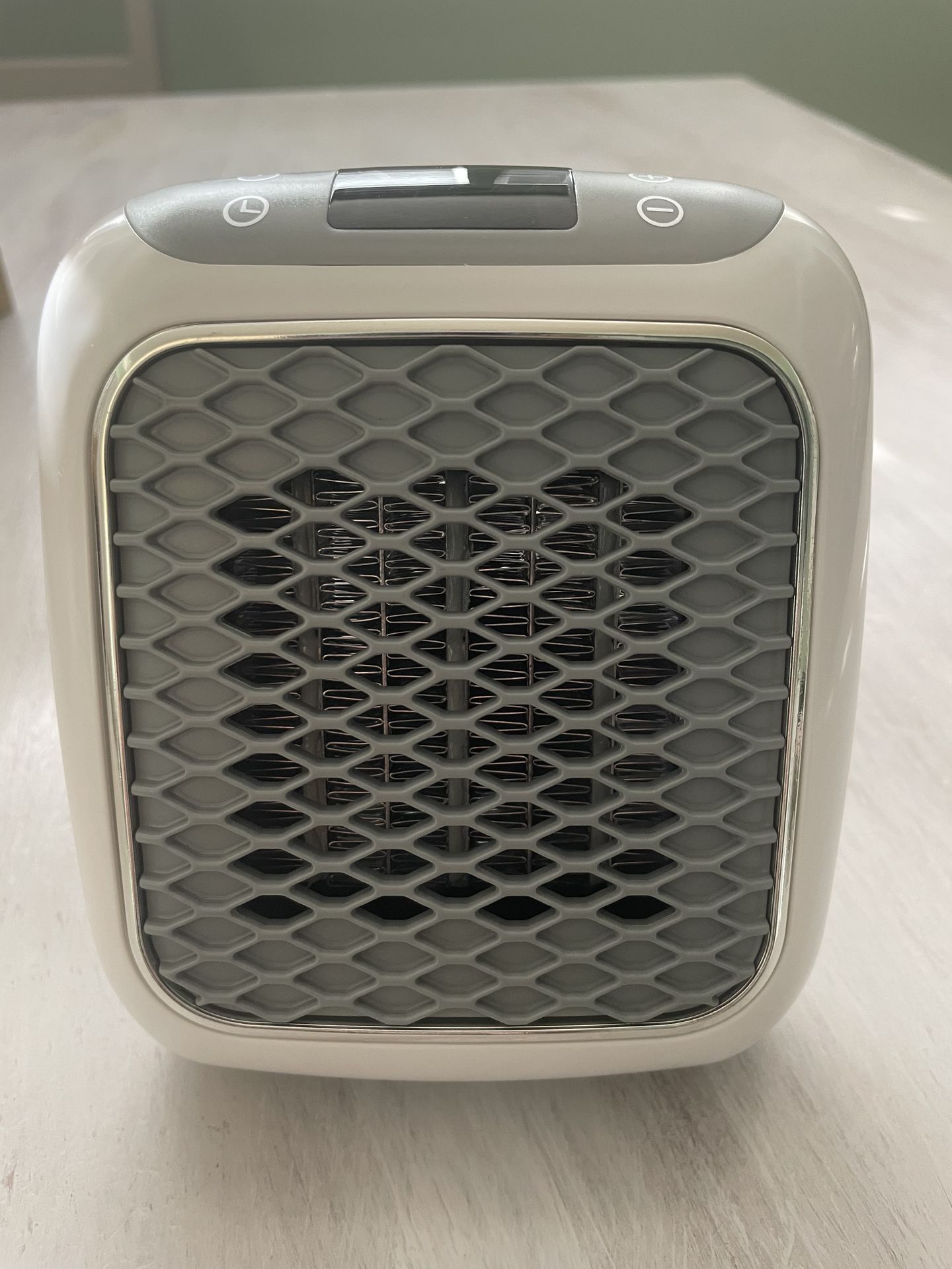 New in box space heater has advanced ceramic technology for quick heat. Adjustable thermostat and twelve hour timer. Designed for in-wall outlet use only