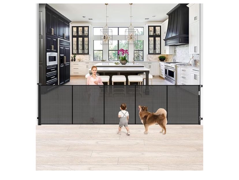 LOCATION: Surprise. 303/Waddell 42 Inch Extra Tall Baby Gate 120 Inch Extra Wide Retractable Baby Gates for Large Openings, Upgraded Retractable Gate Keeps Pets from Getting Under Tall Pet Gate, Indoor/Outdoor Long Dog Gate 2223 OPEN BOX Retail Price: $84.99 NEW REINFORCEMENT - DOG ESCAPE PREVENTION: Our new upgraded retractable gate reinforced with fiberglass effectively prevents babies and dogs from getting under the mesh baby gate. Moreover, the reinforcement keeps the top mesh from sagging and prevents the bottom from lifting. Extra Tall and Extra Wide Baby Gate: Our retractable baby gates fit openings up to 120" wide and stands 42" tall. It effectively prevents pets from jumping over the tall baby gate and smoothly retracts to the desired width. Versatile Retractable Baby Gate: Our extra long baby gate serves not only as an indoor safety gate, pet barrier, semi-enclosed baby fence play area, and fireplace gate, but also functions as an outdoor dog gate, suitable for porches, decks, garages, yards, and more. When not in use, the retractable dog gate smoothly retracts, saving space. Adjustable Tension Locking Mechanism: Our tall dog gate features a locking system with adjustable tension, allowing you to fine-tune the tension to tighten the mesh as needed, ensuring a secure fit when the mesh dog gate is locked. Easy One-Handed Operation: Adults can effortlessly open/close the retractable fence with just 1 hand, while also preventing accidental access by kids. Adjustable Hardware for Any Baseboard: No matter the height or style of your home's baseboards, our extra tall pet gate comes with adjustable hardware, ensuring a seamless fit without the need for additional shims. Certified to Standards: All our extra wide retractable baby gate undergo rigorous safety testing, meeting or exceeding ASTM or EN standards, giving you peace of mind. ** Items are sourced from major retailer returns and overstocks or shelf-pulls and are listed as Like New unless otherwise stated since we cannot fully verify any handling prior to return or while in-store. Stock photos used, and packaging may differ. Outer packaging may have some damage from shipping. Some items may have been removed from packaging. Items are inspected but not all can be tested for complete functionality. Please review the description and photos. Returns are accepted prior to use if there are any issues.