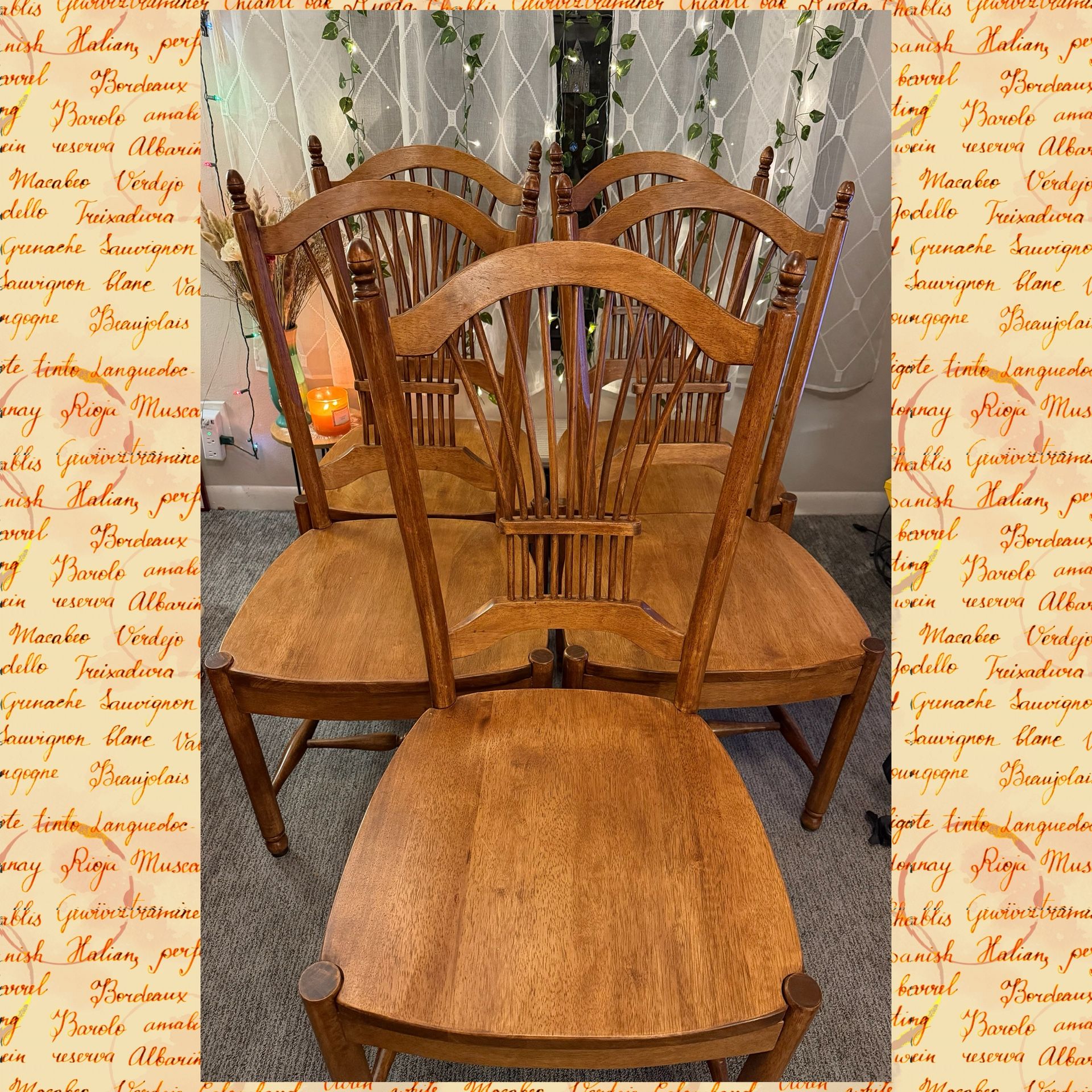 Pick up in West Boca Raton and cash only please Seat Dimensions 19 X 18 Top to Bottom 41” Floor to seat 17.5” A set of 5 beautiful farmhouse style wood chairs in good condition. They would pair well with glass or wood tables. Beautiful, comfortable, and a great price!