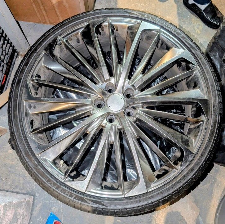 22 in rims with 35 in tires. 4 tire with rims 2 extra rims