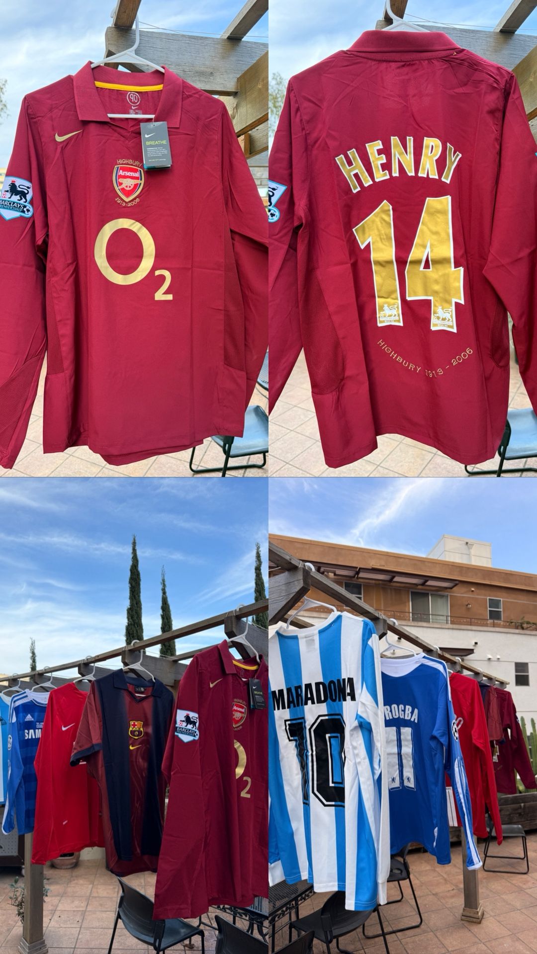 $50 each US standards: Maradona - M size Henry - L size Barça - L size Ronaldo - L size Drogba - M size